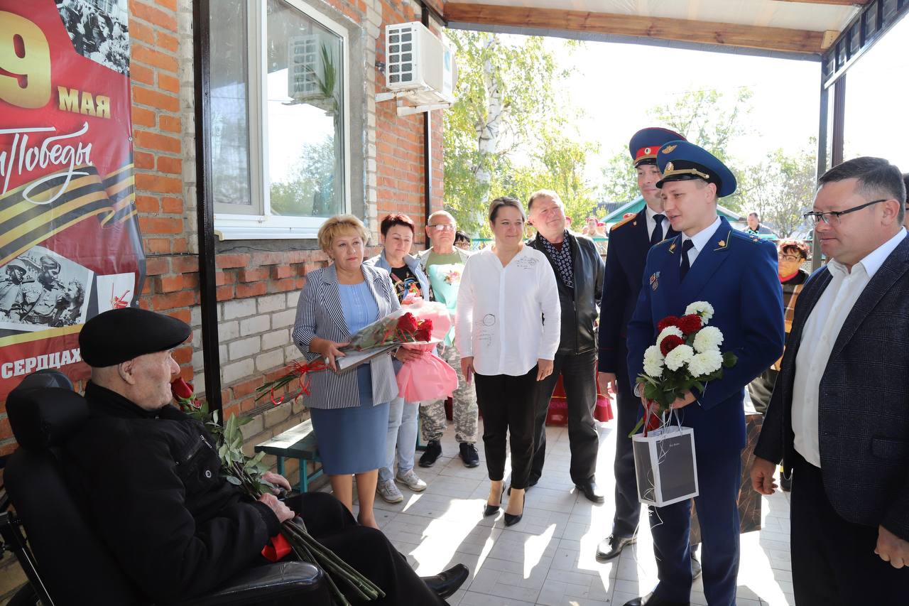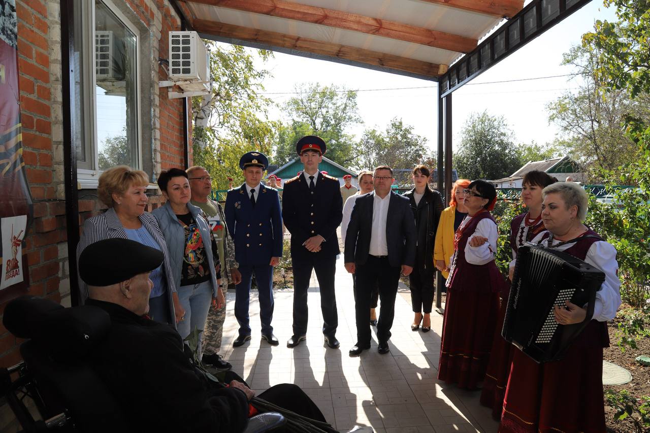 Прокурор Крыловского района Максим Крамаренко совместно с главой Крыловскогорайона Виталием Демировым, руководителем Павловского МСО СУ СК по краю Олегом Дубовиком, главой Крыловского сельского поселения Светланой Яковлевой, учащимися МБОУ СОШ № 2 - участниками движения Юнармия поздравили ветерана Великой Отечественной войны Владимира Федоровича Леоненко с 98-м днем рождения
