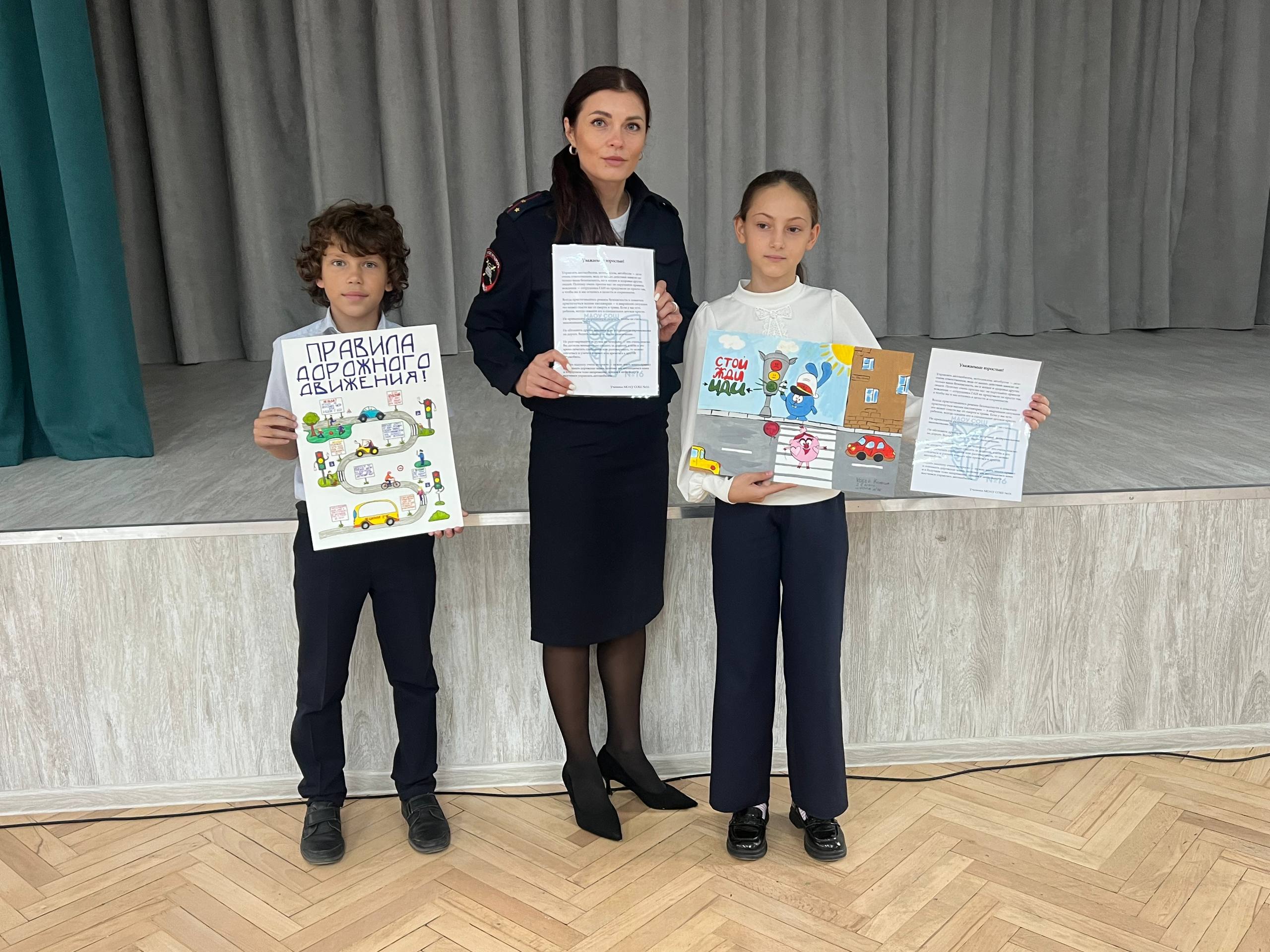 Школьники подготовили и вручили автоинспектору яркие тематические рисунки в знак внимания и признательности за проведённый урок.
