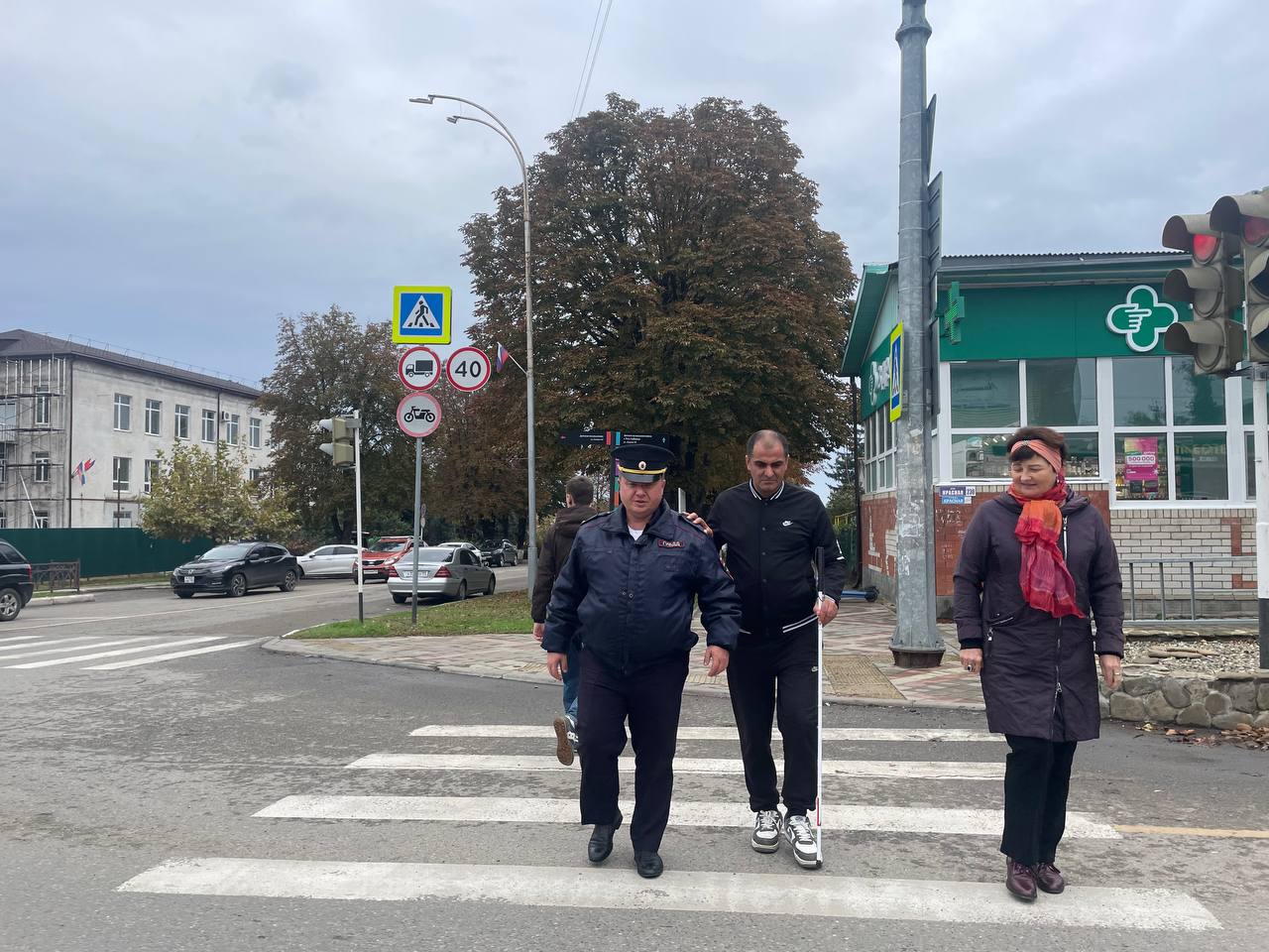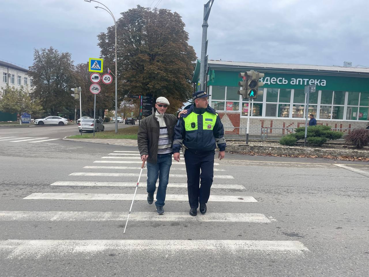 Автоинспекторы не просто раздавали тематические листовки, но и лично помогали слабовидящим пешеходам безопасно переходить дорогу.