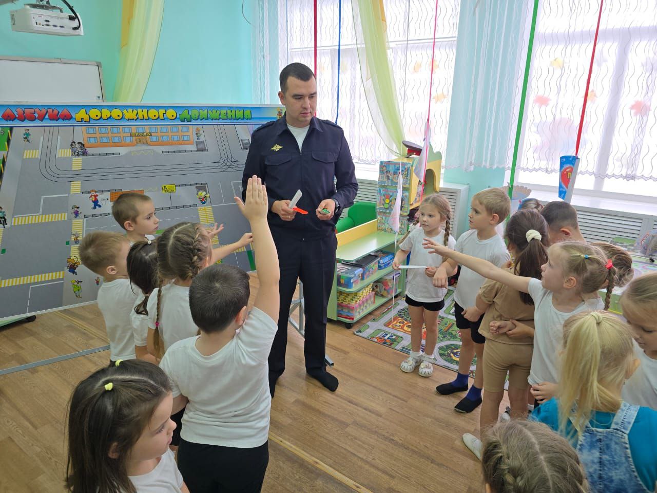 Ребята в игровой форме изучали правила дорожного движения, а также отвечали на вопросы госавтоинспектора. За это каждый воспитанник детского сада получил в подарок световозвращающий браслет на руку.