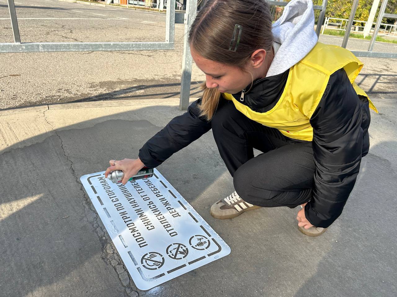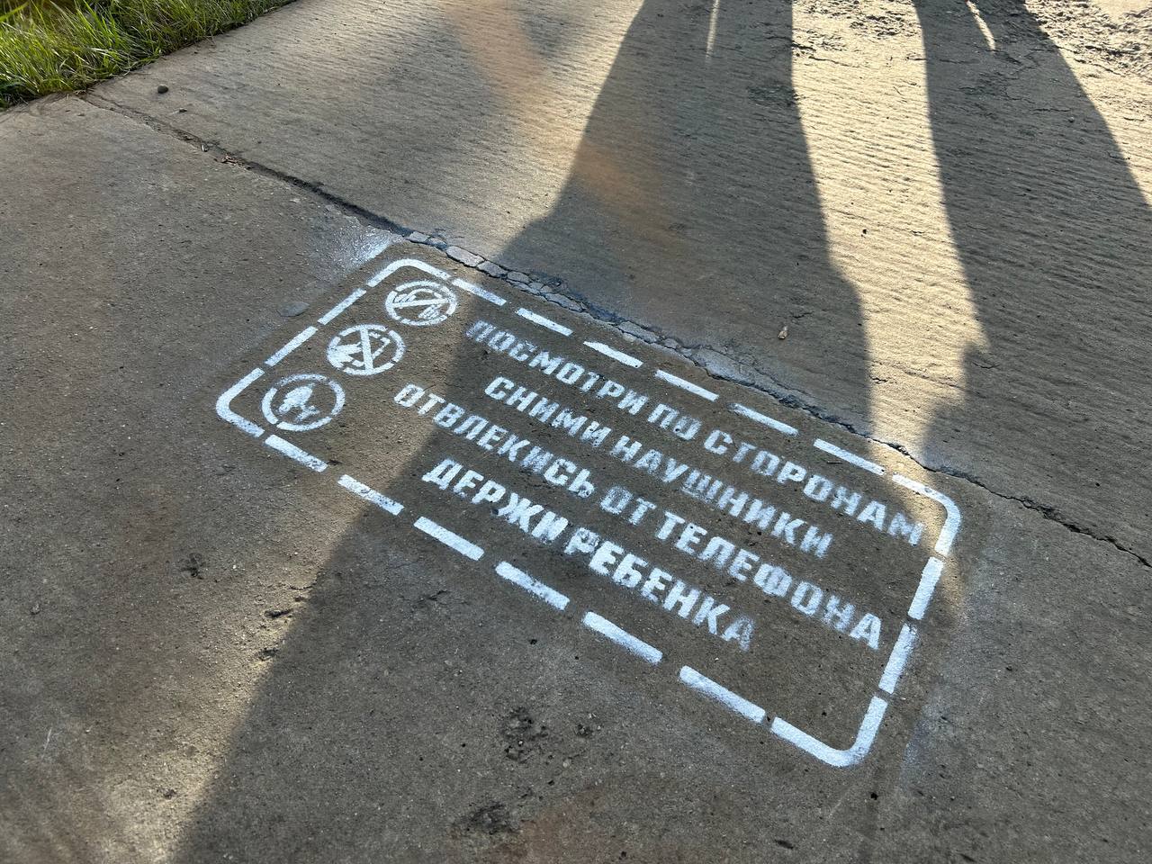 Участники акции вышли к пешеходным переходам вблизи школы и с помощью трафаретов и баллончиков с краской нанесли на асфальт надписи, призывающие участников дорожного движения к соблюдению ПДД: «Сними наушники! », «Посмотри по сторонам», «Отвлекись от телефона», «Держи ребенка».