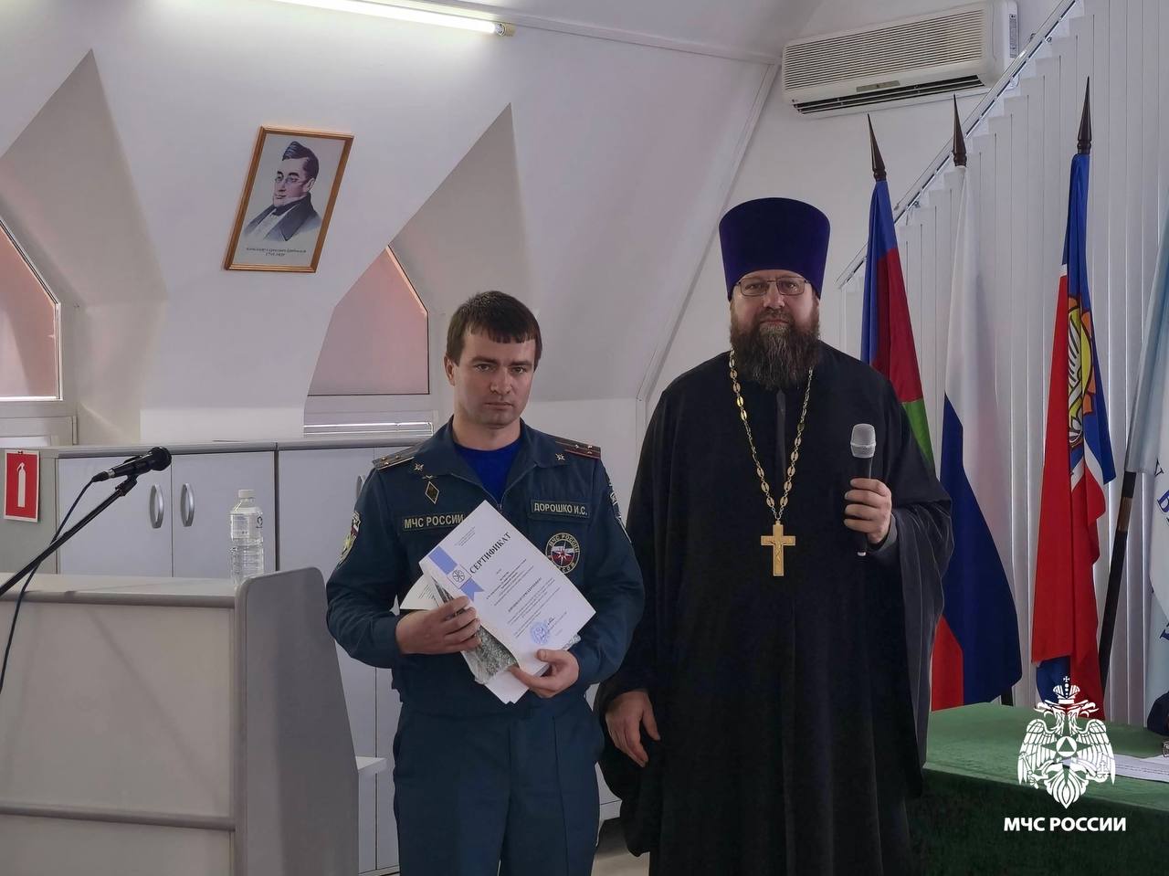 В чтениях принял участие начальник 45й пожарноспасательной части 1го пожарноспасательного отряда ГУ МЧС России по Краснодарскому краю Игорь Дорошко. Он представил доклад «Духовнонравственные аспекты любви к отечеству: источники и проявления в структуре МЧС России».