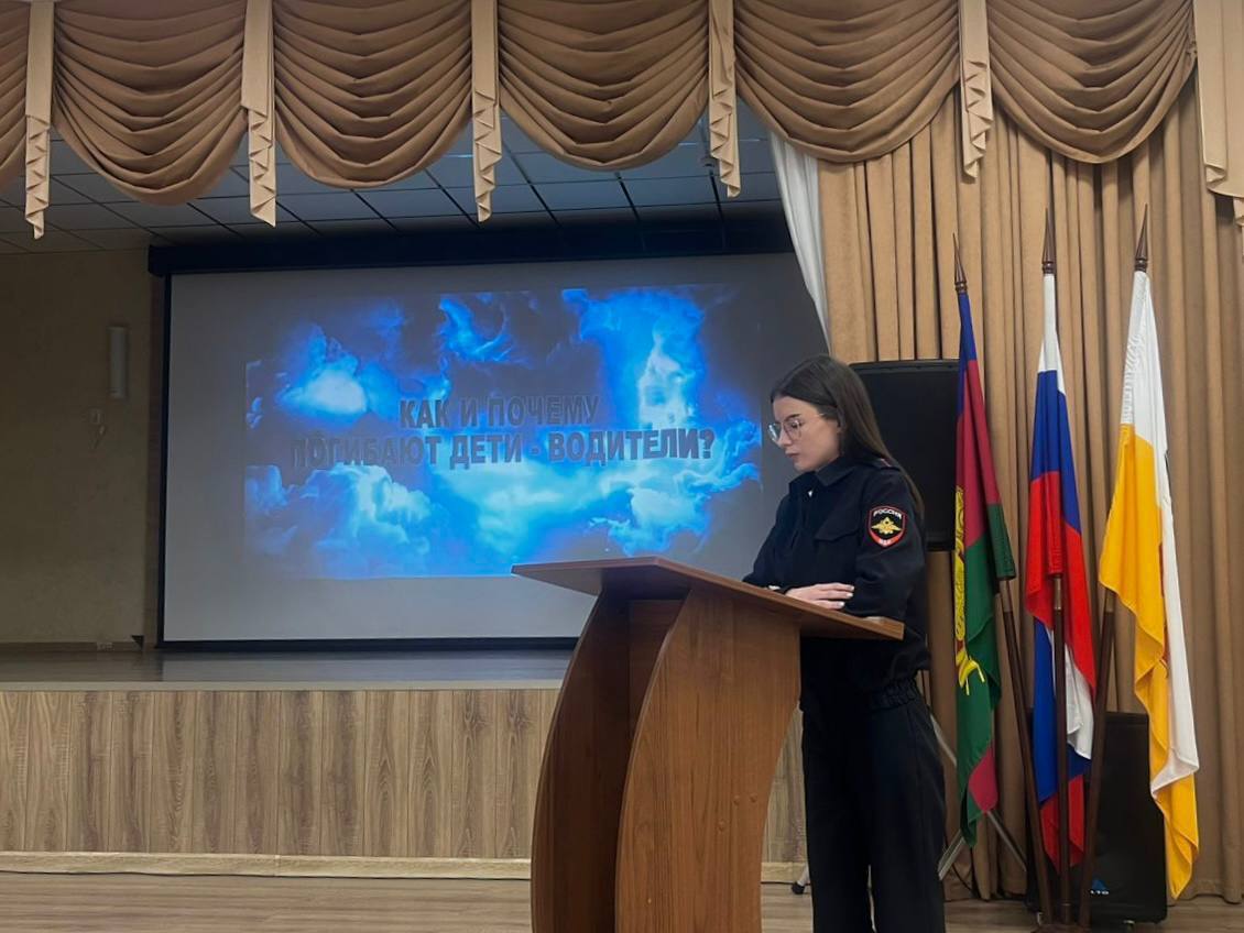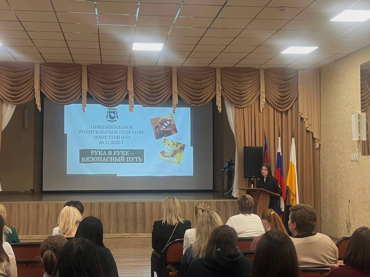 Сотрудники отделения ПБДД Отдела Госавтоинспекции Управления МВД России по городу Краснодару в рамках Всемирного дня ребёнка приняли участие в общешкольном родительском собрании в МАОУ СОШ № 52