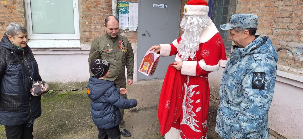 Сотрудники линейного отдела МВД России на станции Кавказская совместно с членом Общественного совета при линейном отделе Ниной Боевой и председателем Совета ветеранов подполковником внутренней службы в отставке Александром Браславецом приняли участие во всероссийской акции «Полицейский Дед Мороз».