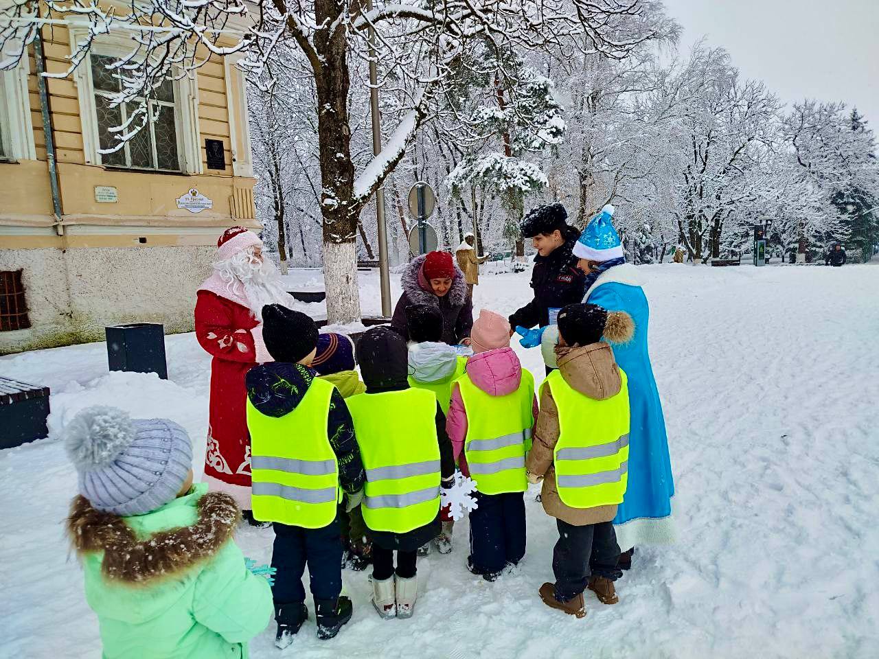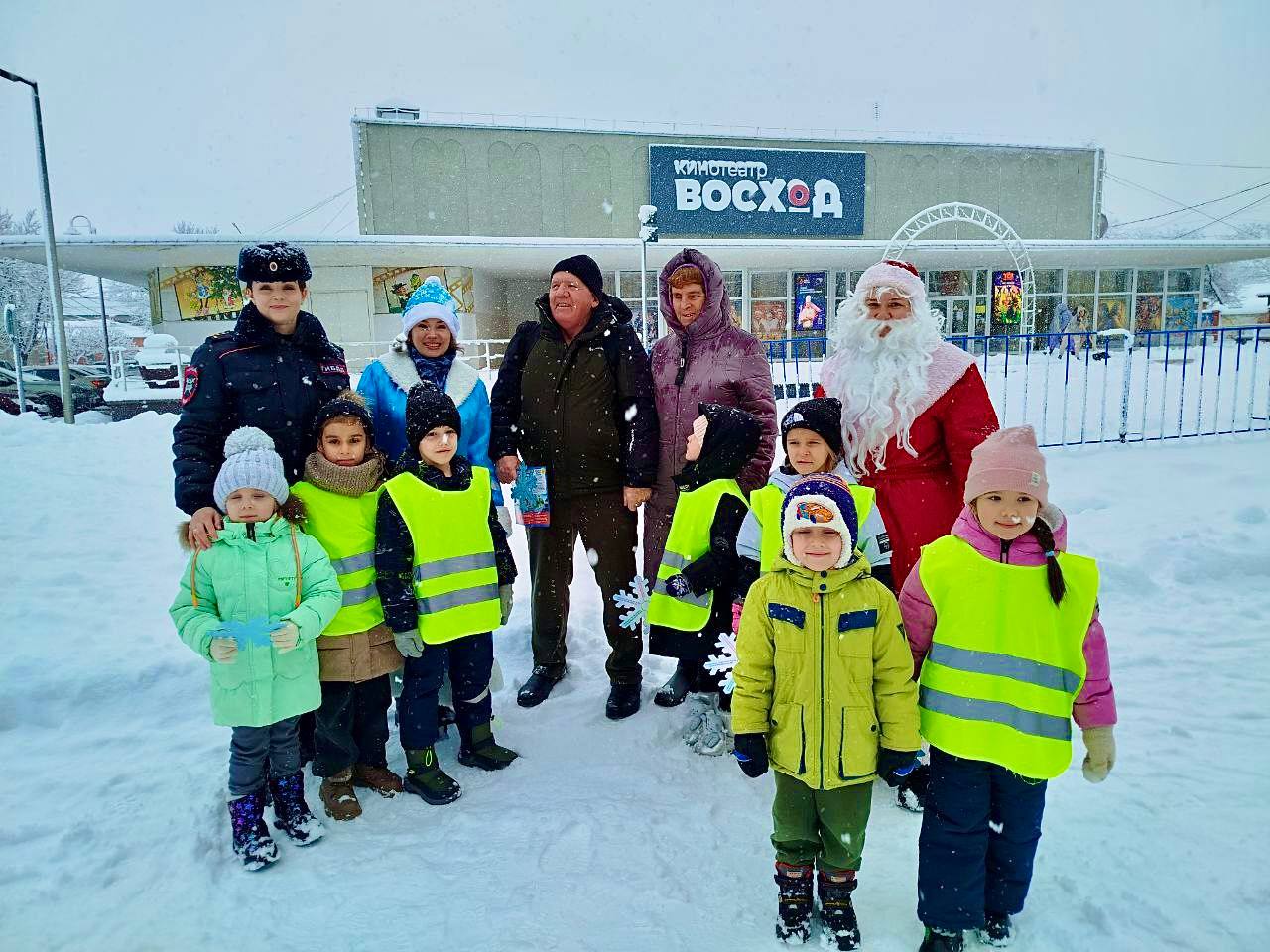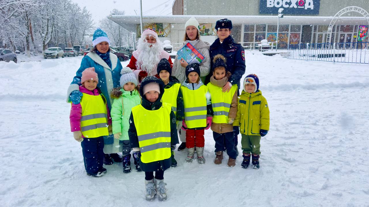 Дед Мороз и Снегурочка поздравляли всех с наступающим Новым годом, вручили снежинки с напоминаниями о соблюдении ПДД и световозвращающие наклейки.