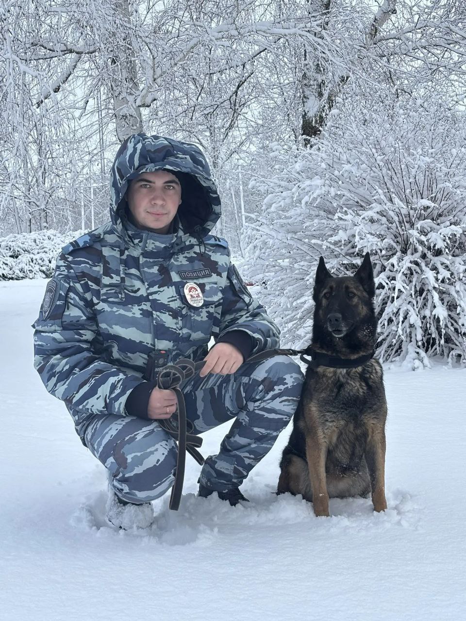 Доброго снежного утра и отличного настроения желают всем гостям и жителям Кубани младший инспектор-кинолог Отдела МВД России по Щербиновскому району Максим Шилов со своей четвероногой напарницей бельгийской овчаркой по кличке Джесси.
