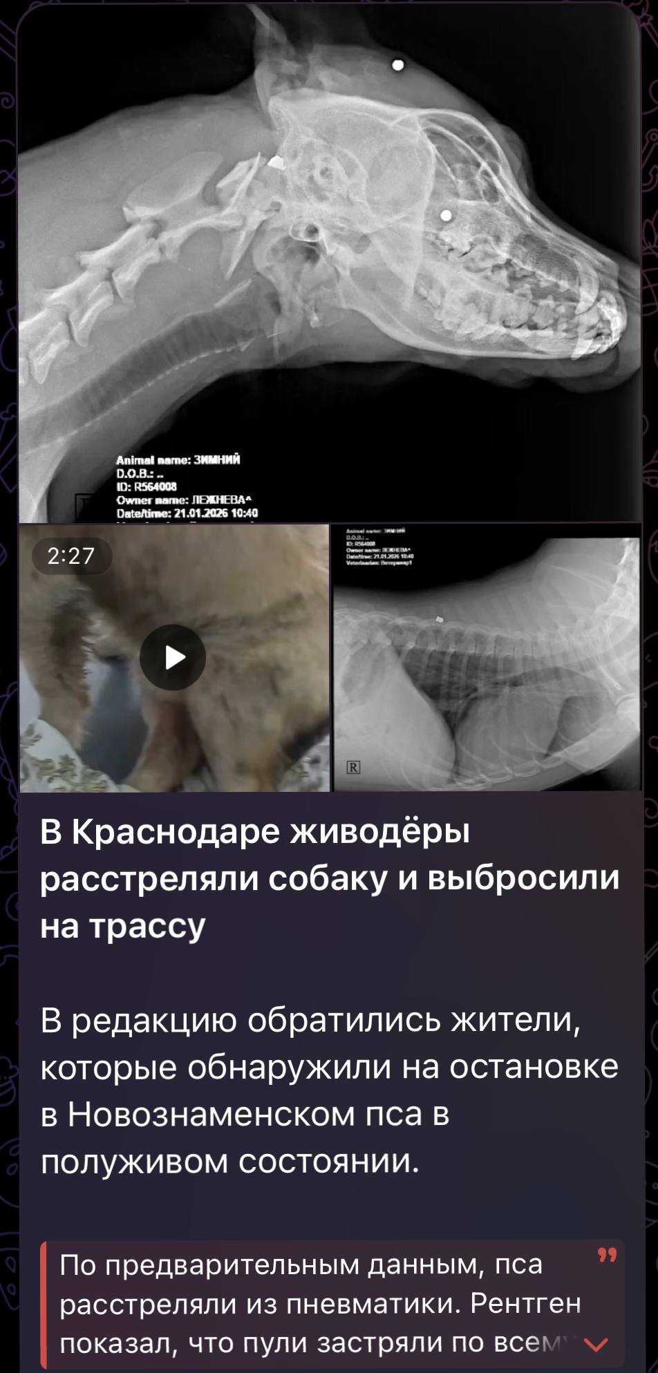 На основании выявленных в средствах массовой информации сведений об обнаружении местными жителями в поселке Новознаменском пса с ранениями, возможно полученными в результате применения пневматического оружия, инициировано проведение доследственной проверки.