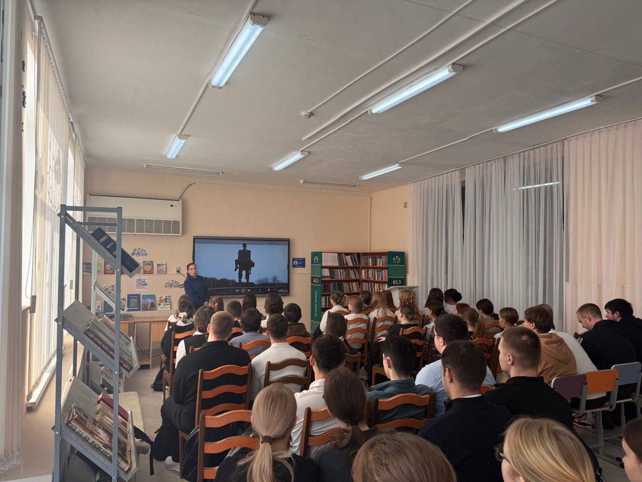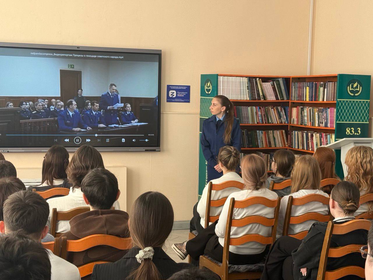 Сегодня, 30 января, помощником прокурора Тимашевского района проведена встреча с учащимися 10-11 классов МБОУ СОШ № 1 на которой представлен просветительский видеорепортаж, подготовленный Генеральной прокуратурой, посвященный участию прокуроров в судебных процессах о геноциде советского народа в годы Великой Отечественной войны 1941-1945 годов.