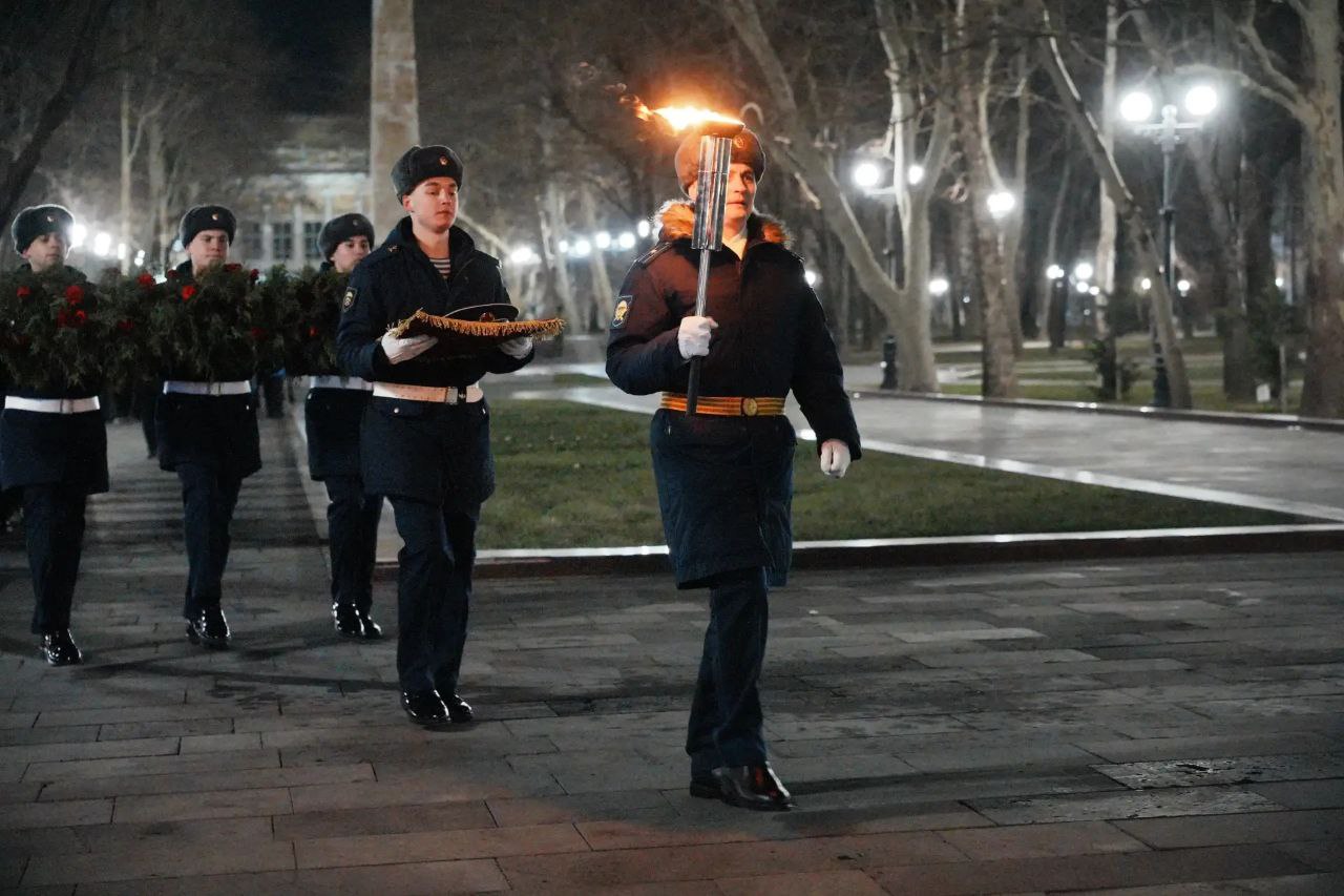 Стражи порядка, волонтёры и неравнодушные граждане с факелами прошли по маршруту к месту высадки десанта и спустили на воду бекозырку - символ памяти о тех, кто мужественно и стойко сражался на Малой земле.