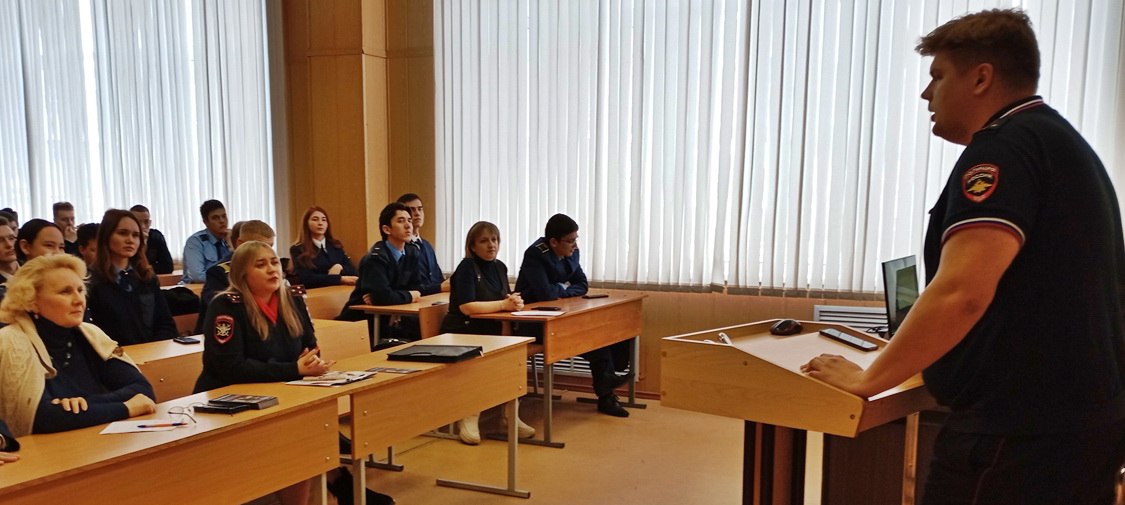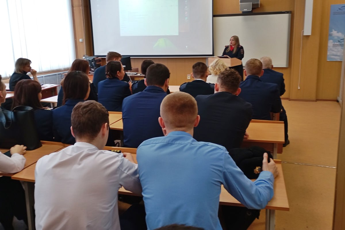 Полицейский рассказала присутствующим о случае выявления в 2021 году курсанта, который пропагандировал и демонстрировал в сети «Интернет» символику и атрибутику, запрещенные федеральными законами Российской Федерации.