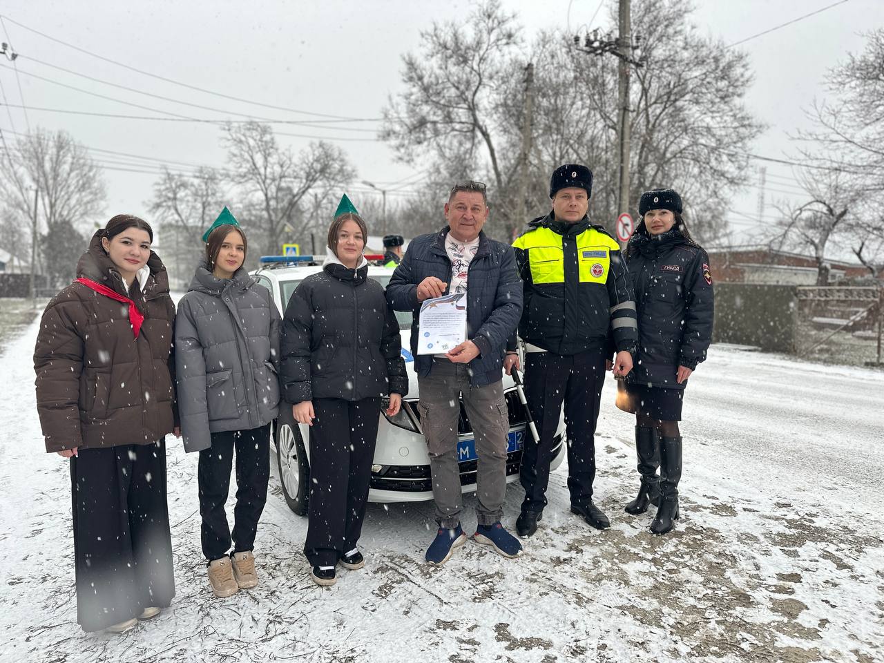 Сотрудники Госавтоинспекции Староминского района, школьники отряда ЮИД и активисты «Движения первых» поздравили мужчин – водителей с наступающим Днем защитника Отечества