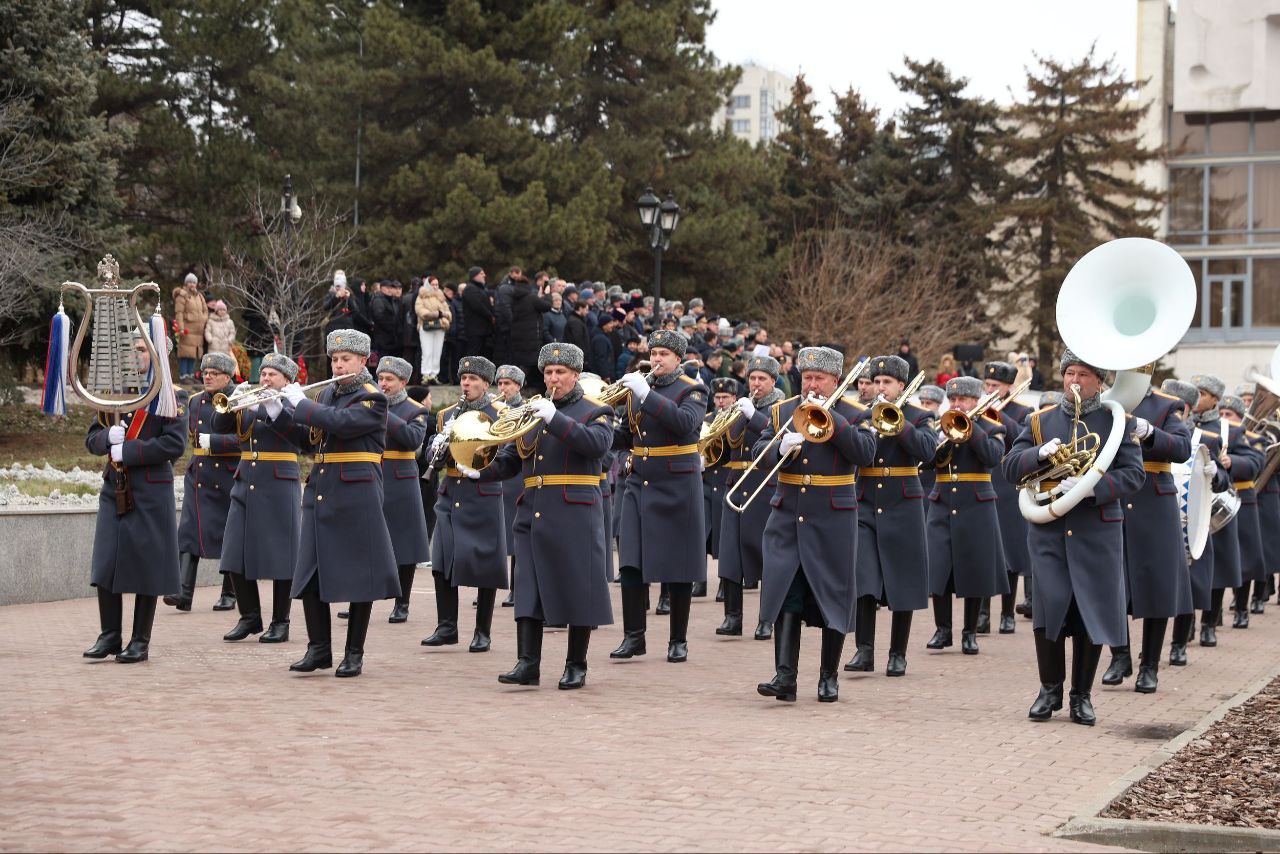 Торжественным маршем у мемориала прошли рота почетного караула и военный духовой оркестр Южного военного округа.
