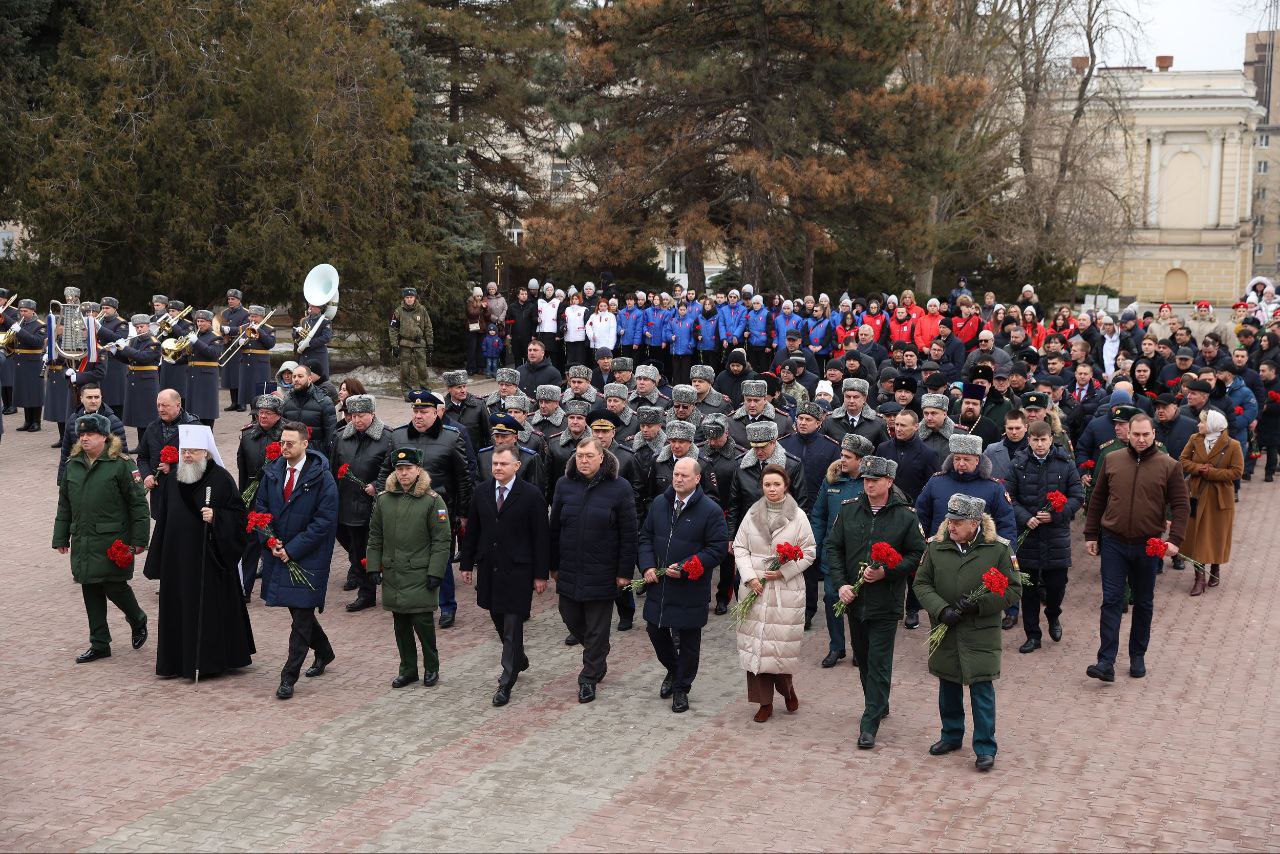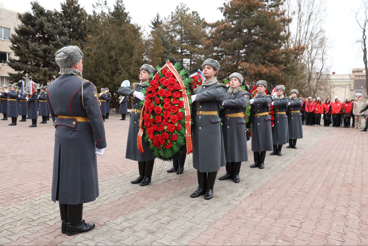 В сквере имени Фрунзе в Ростове-на-Дону состоялась церемония возложения венков и цветов к мемориальному комплексу «Павшим воинам», посвященному бойцам Советской армии и мирным жителям, погибшим в период оккупации и в боях за город.