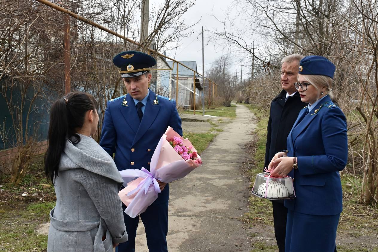 В преддверии празднования Международного женского дня - 8 Марта 2026прокурор Мостовского района Алексей Минаков совместно с заместителем главы муниципального образования Мостовский район, координатором Фонда «Защитники Отечества» поздравил супругу погибшего участника специальной военной операции.