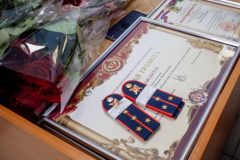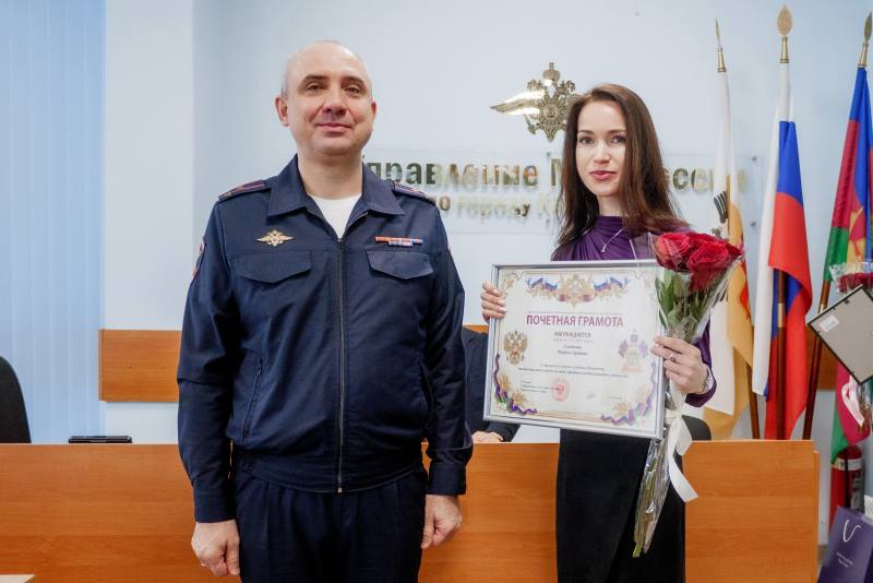 В ходе мероприятия руководитель Управления торжественно вручил сотрудникам полиции погоны со специальными очередными званиями. Почетной грамотой Министерства внутренних дел Российской Федерации наградили лейтенанта полиции Шпаченко Юлию, младшего инспектора-кинолога центра кинологический службы городского УМВД; Благодарностью Министерства внутренних дел Российской Федерации – Сецко Ирину, документовода (1 категории) группы по обработке входящей и исходящей корреспонденции отдела делопроизводства и режима Управления. Почетной грамотой начальника ГУ МВД России по Краснодарскому краю – подполковника юстиции Кобзарь Ирину, заместителя начальника отдела по расследованию преступлений на обслуживаемой территории отдела полиции (Карасукский округ); капитана полиции Колодкину Анастасию, старшего инспектора отделения по делам несовершеннолетних отдела полиции (Прикубанский округ), федерального государственного гражданского служащего Марину Самойлову, специалист-эксперт отделения по контролю за оборотом наркотиков отдела полиции (Центральный округ).