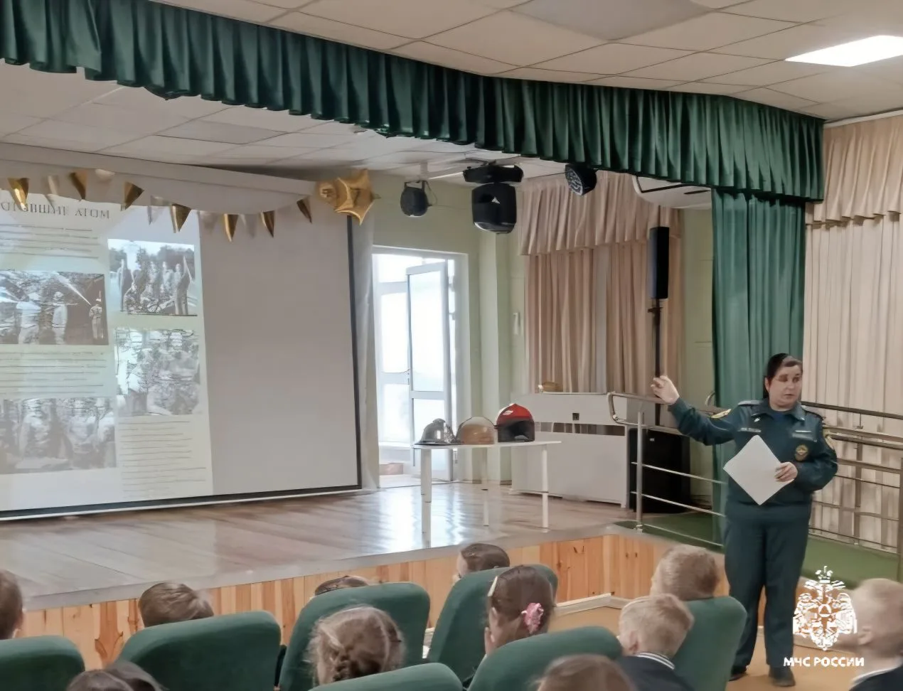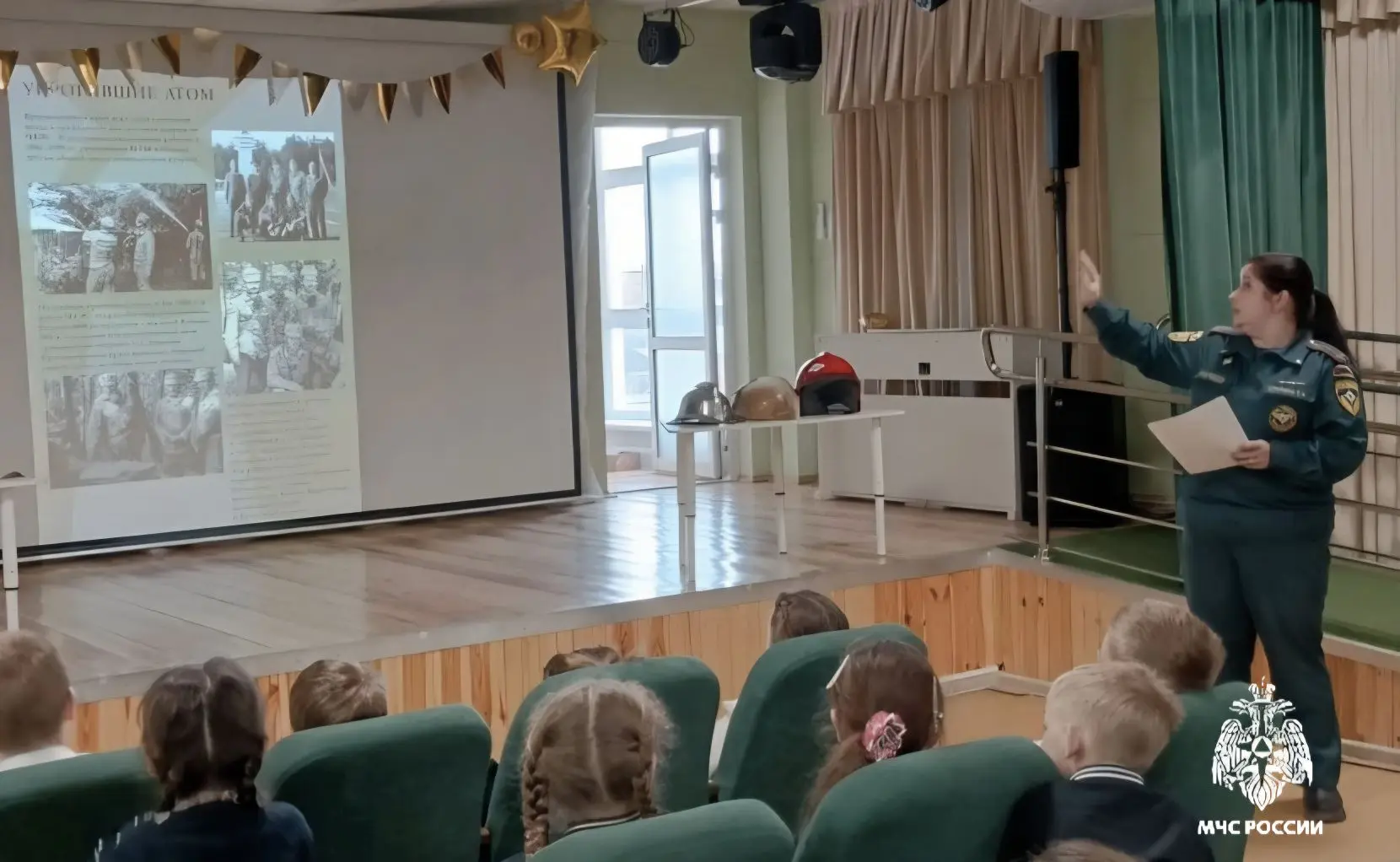 Учащиеся начальных классов познакомились с мультимедийной выставкой «Укротившие атом», которую представила Екатерина Стулина, начальник краевой пожарно технической выставки. Экспозиция рассказывает о подвиге ликвидаторов аварии на ЧАЭС и последствиях одной из крупнейших катастроф в истории мирного атома.
