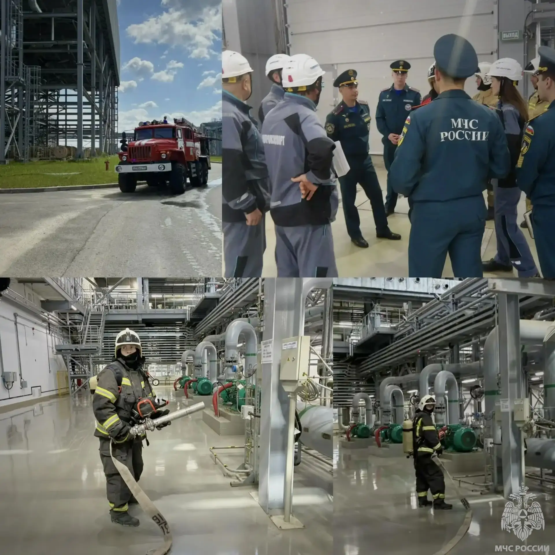 В ходе учений была смоделирована ситуация возгорания в здании паротурбинной установки (ПТУ), что позволило отработать действия по тушению условного пожара.