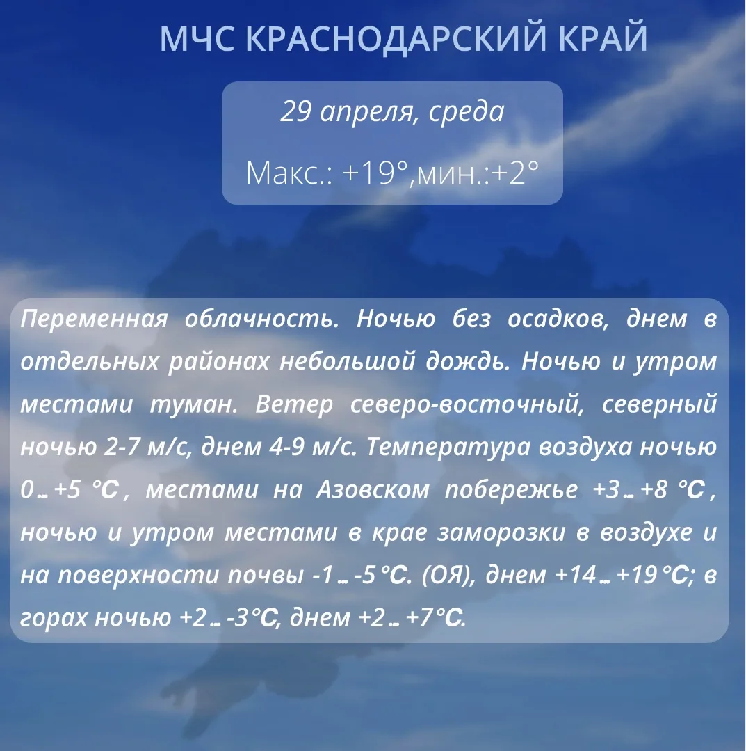 На 29 апреля Гидрометцентр прогнозирует: переменная облачность. Ночью без осадков, днем в отдельных районах небольшой дождь. Ночью и утром местами туман.