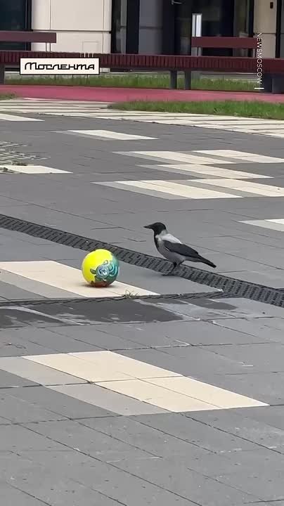 Столичная ворона устроила тренировку с мячом прямо возле метро «Динамо».
