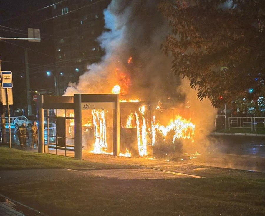 В Краснодаре около остановки «Рождественский храм» полностью сгорел троллейбус.