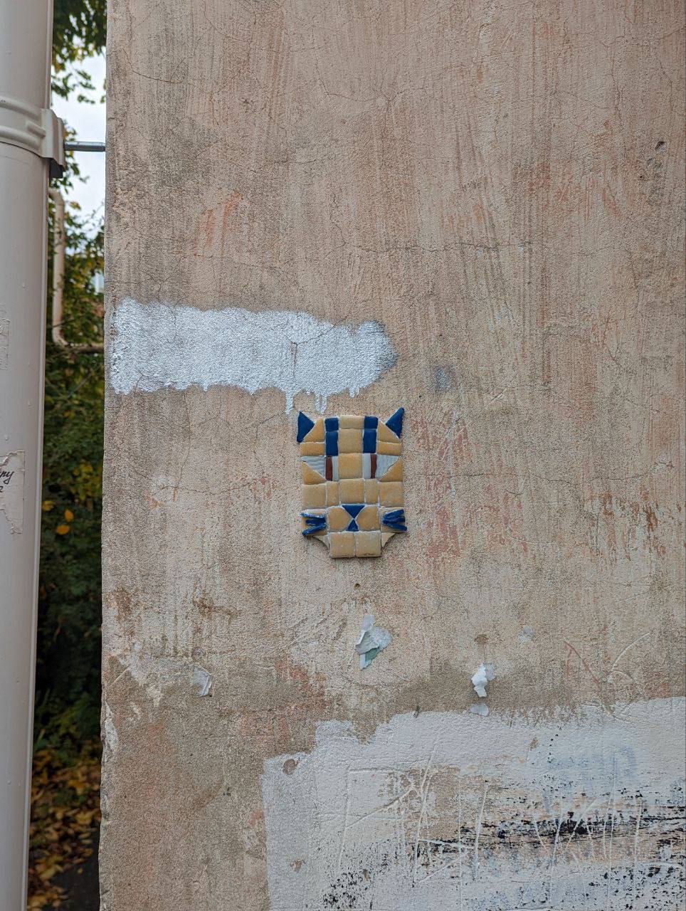 Он сделал мозаику в виде мордочки кота и символично разместил её на здании, форма которого напоминает кота