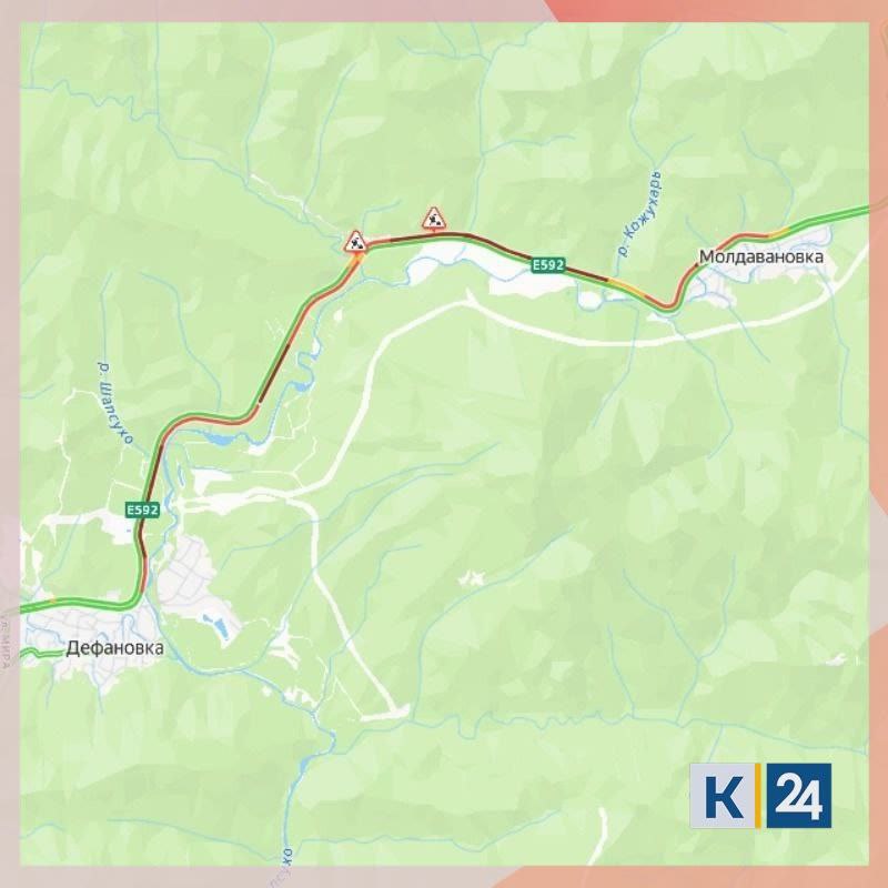 Трасса между Дефановкой и Молдавановкой полностью окрасилась в бордовый — почти без движения можно простоять 1-2 часа.