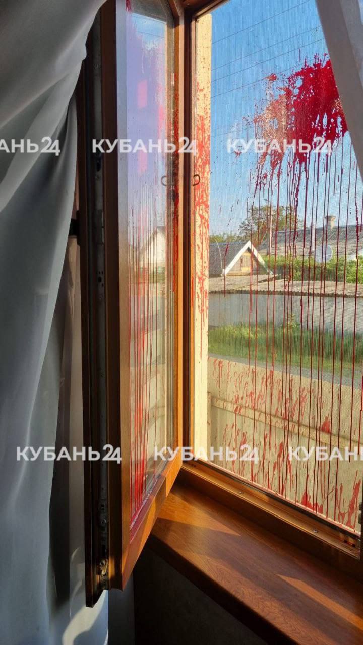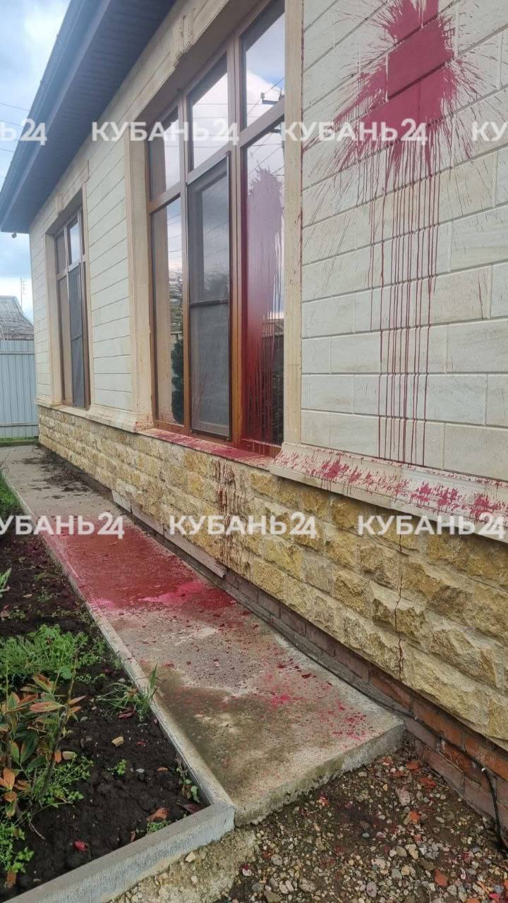 Стены и окна дома облиты красной краской, а на заборе — оскорбления.