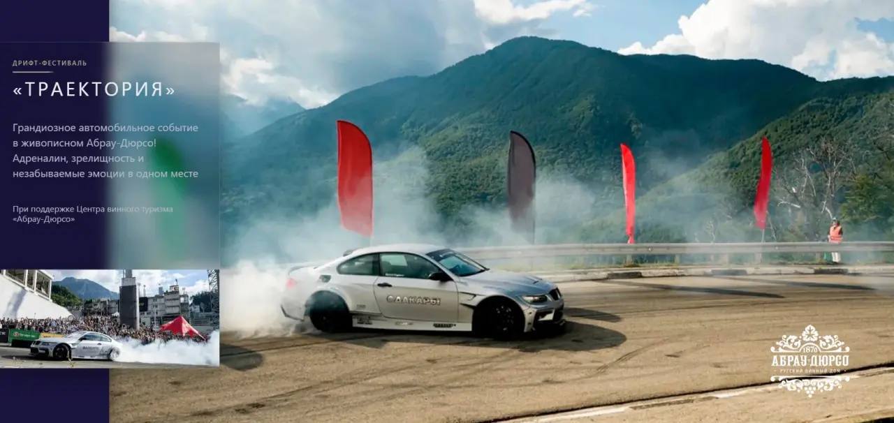«Мы создали пространство, где виртуозное мастерство дрифта, энергия большого спорта и безупречный вкус к деталям сливаются воедино. Вас ждет не просто дрифт, а настоящее шоу! В программе мощные заезды, убойный фудкорт, стритбол, стантрайдинг, кисзевол челлендж, крутые диджеи и незабываемая ночная дискотека! Фестиваль «ТРАЕКТОРИЯ» - это не только зрелищные соревнования, но и возможность окунуться в мир автомобильной культуры. А живописные пейзажи Абрау-Дюрсо станут идеальным фоном для этого драйвового события, сочетая мощь моторов с красотой виноградников и озера», - говорится на сайте мероприятия.
