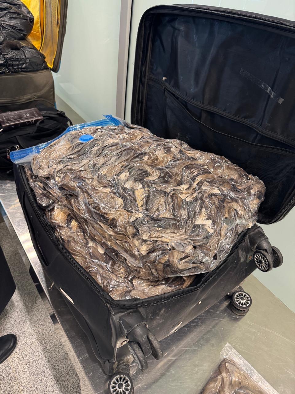 Мужчину остановили в «зеленом» коридоре в «Домодедово». Во время досмотра багажа инспекторы нашли вакуумные пакеты с ценным товаром. Нарушитель пояснил, что хвосты куницы, общей стоимостью примерно 183 тыс. рублей, перевозит для создания поделок в детском лагере.