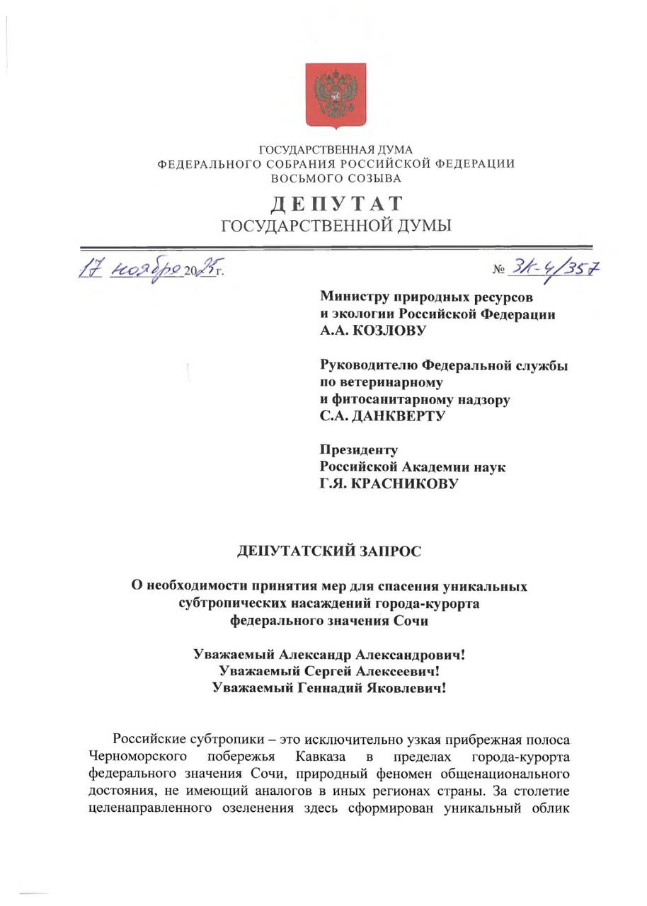 Константин Затулин: ДЕПУТАТСКИЙ ЗАПРОС. О необходимости принятия мер для спасения уникальных субтропических насаждений города-курорта федерального значения Сочи
