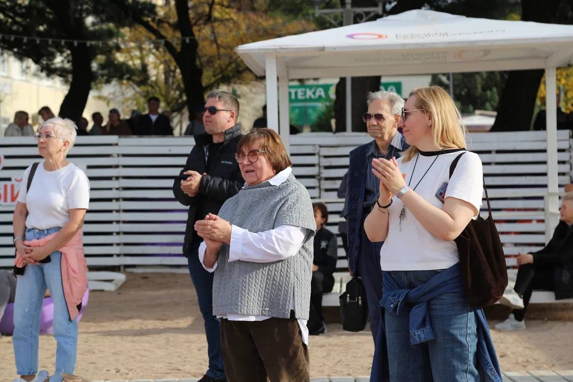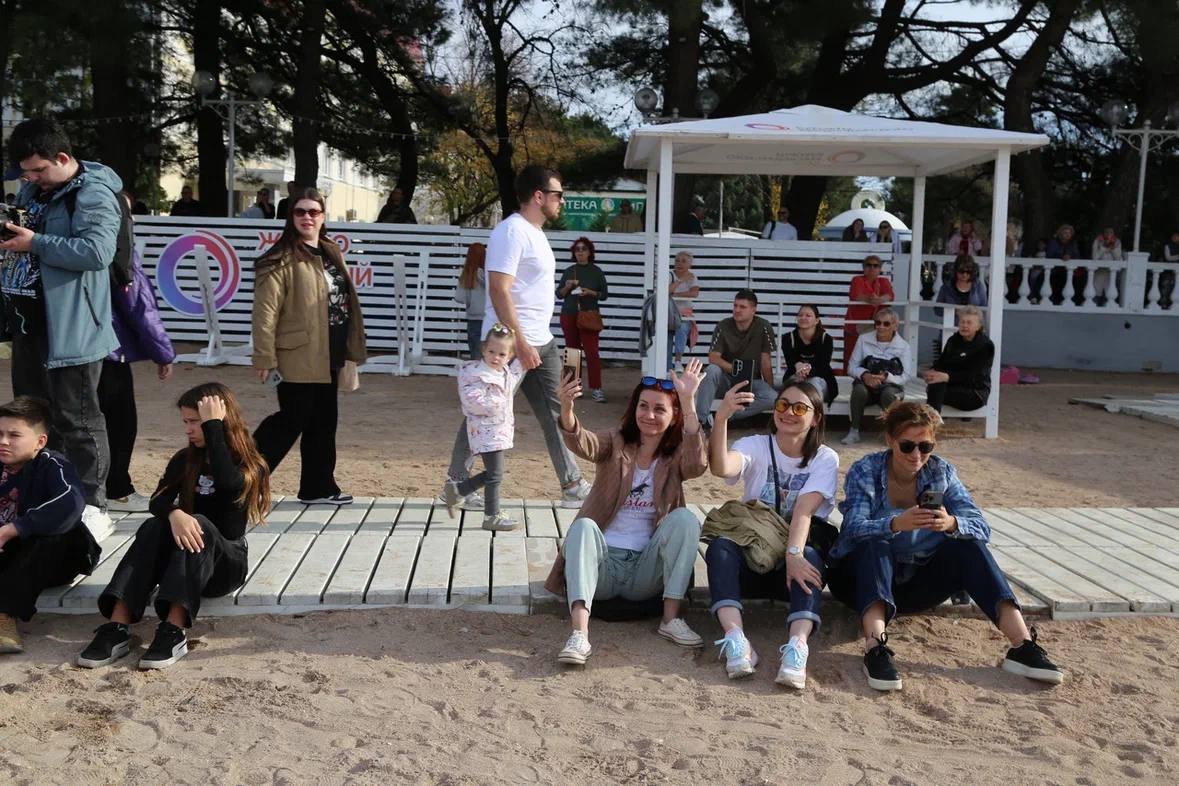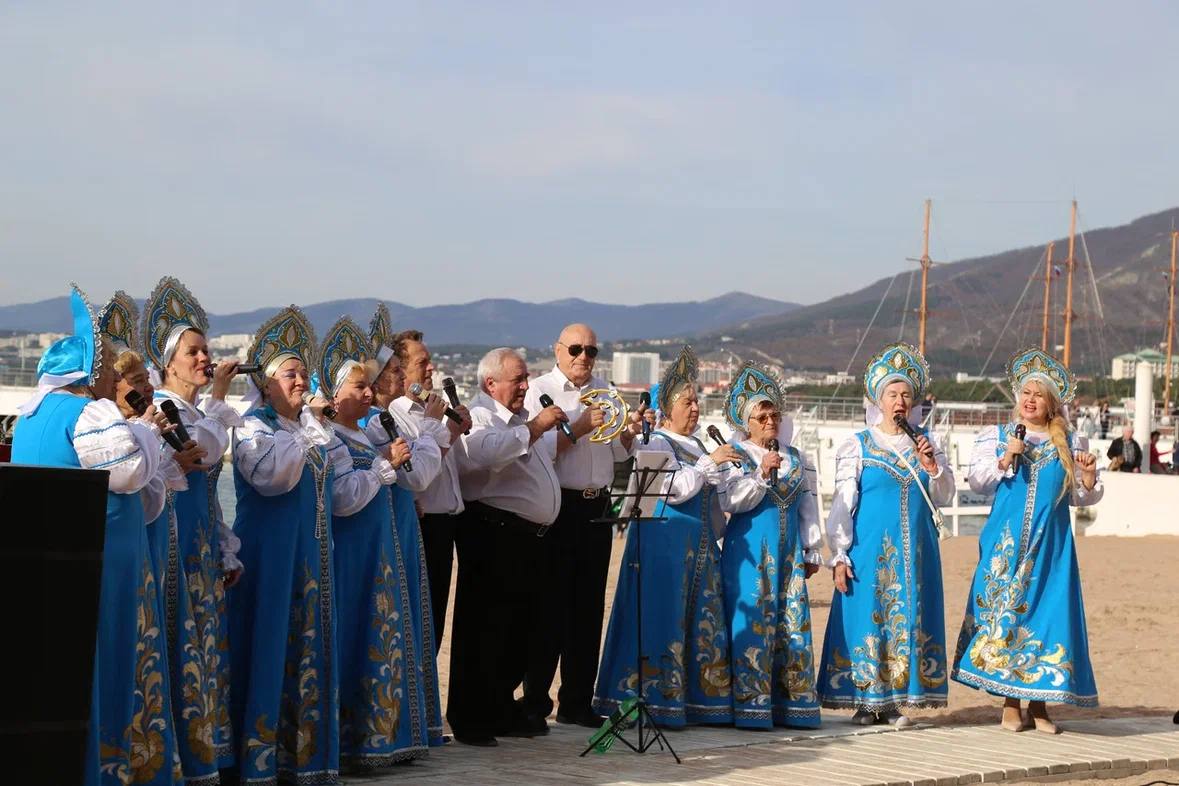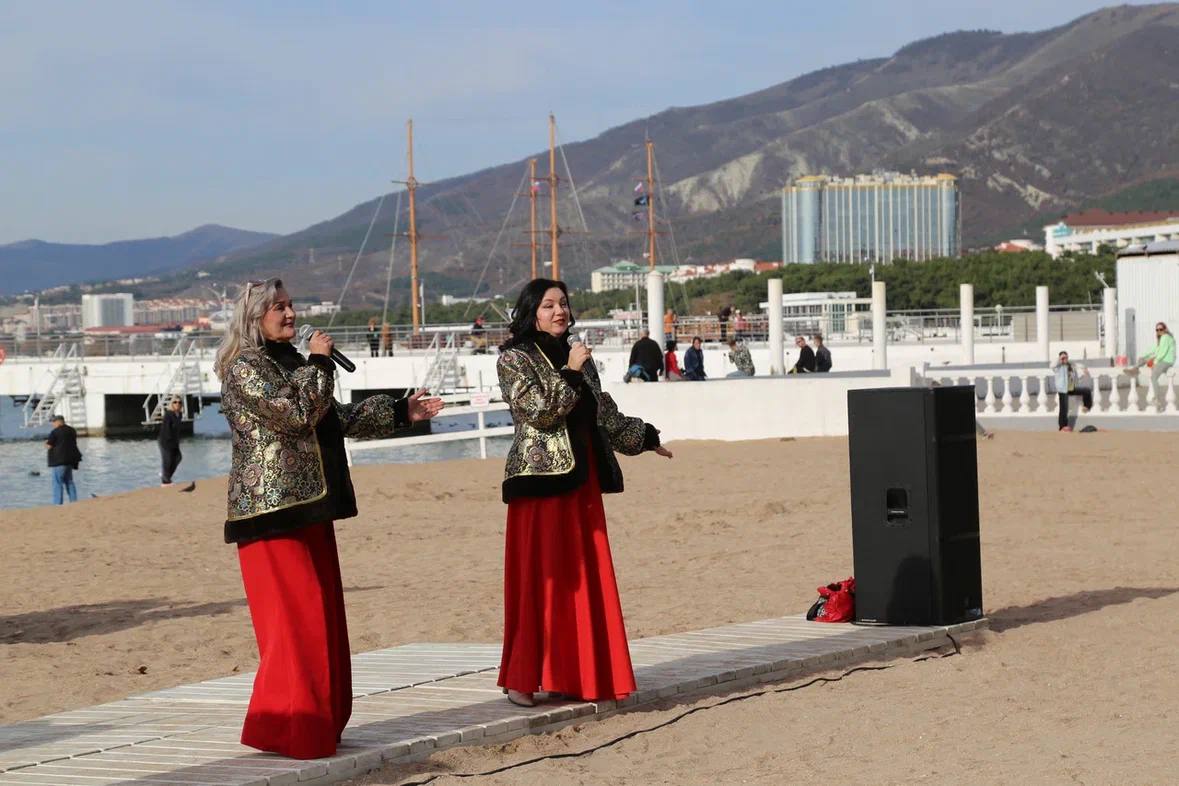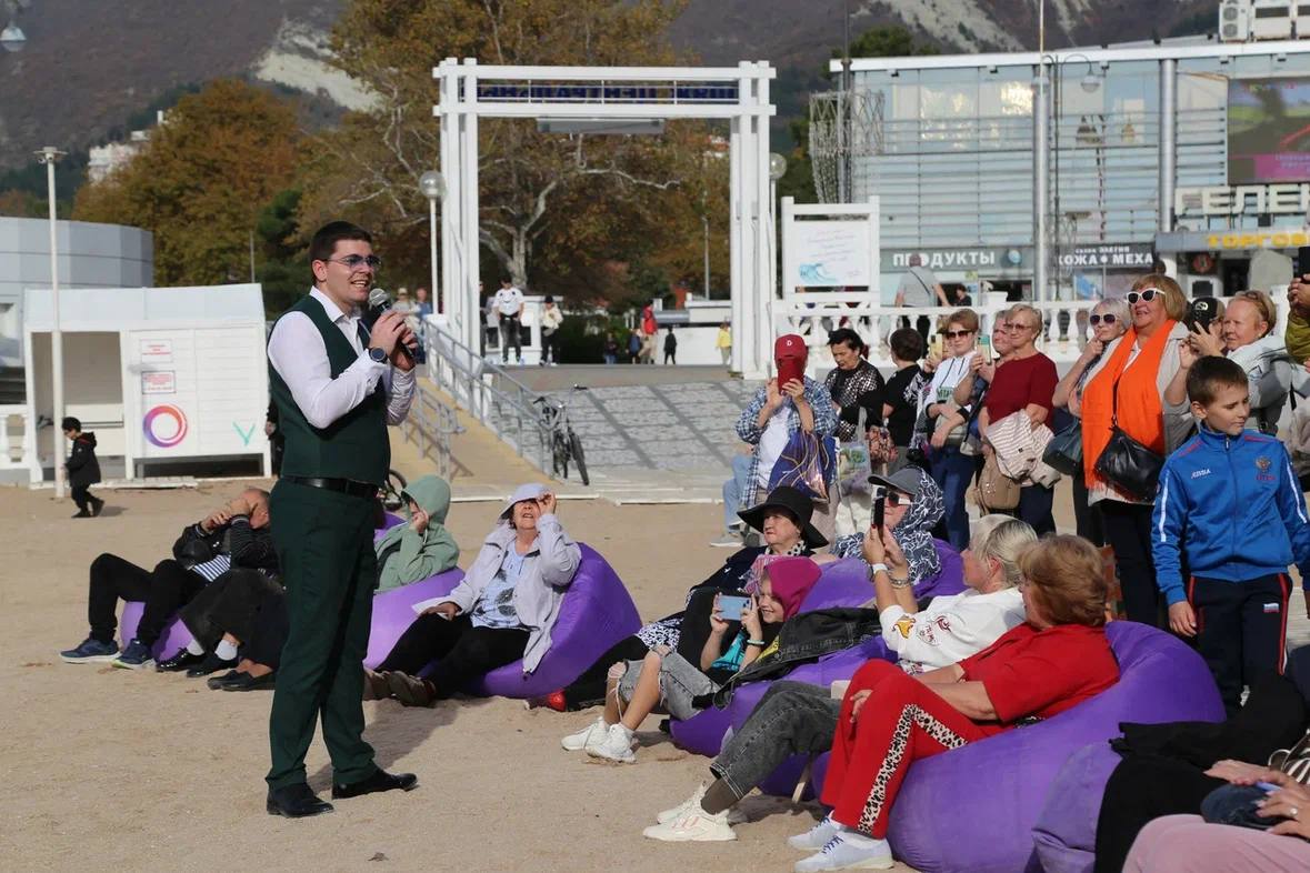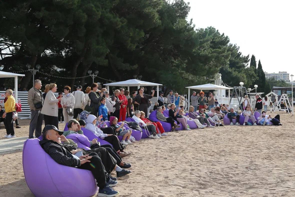 Традиционно на Центральном пляже Геленджика состоялся концерт с участием вокальных коллективов и солистов. Атмосфера была творческой и живой, собралось много зрителей. Зрители разместились на мягких бескаркасных пуфах.