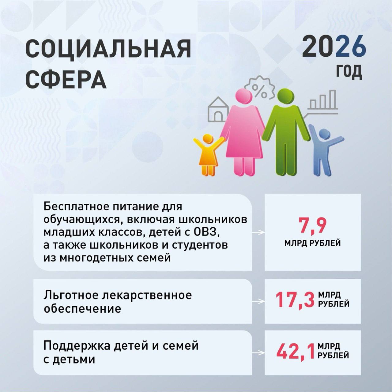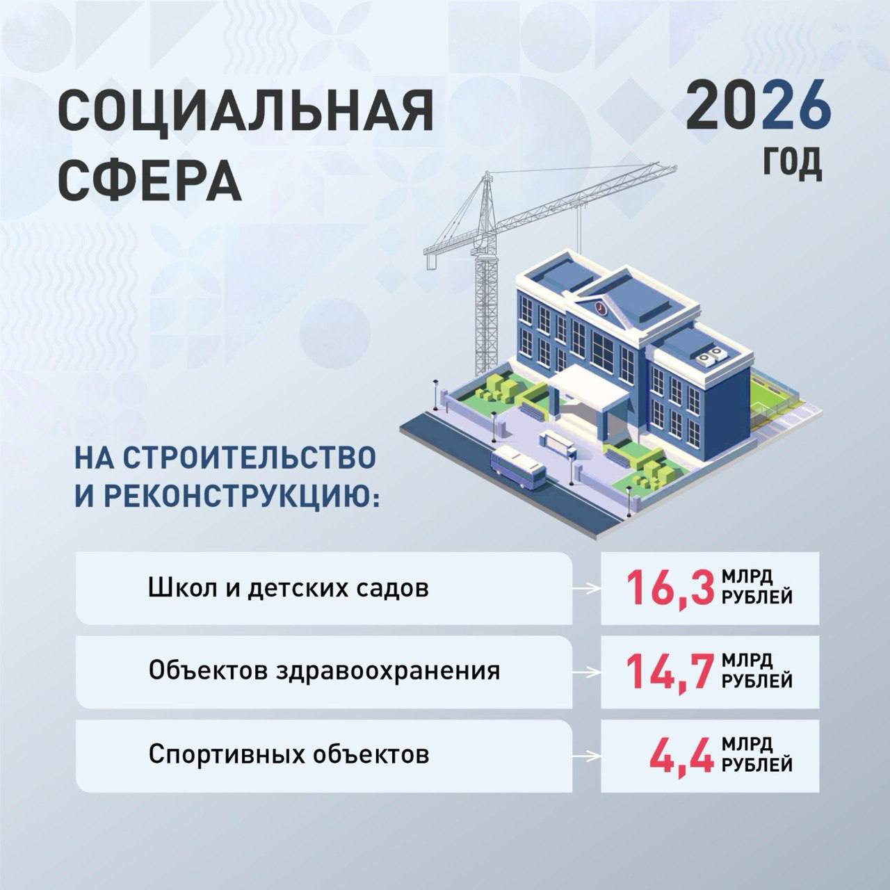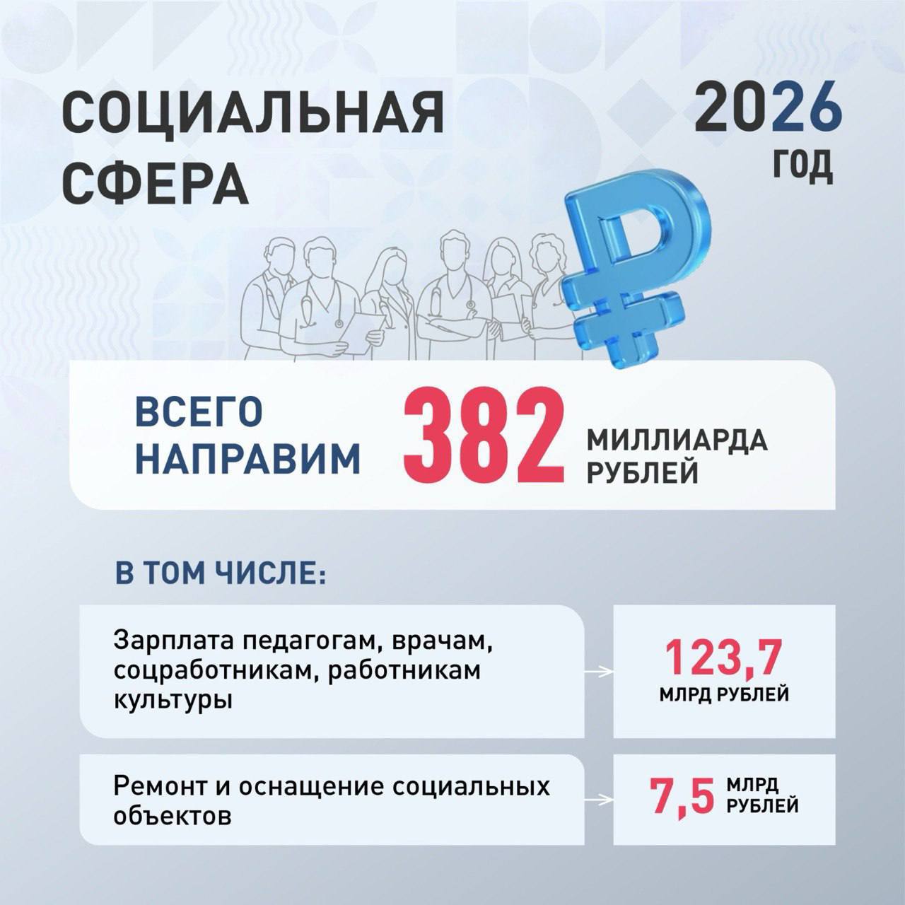 382 миллиарда рублей направят на социальную сферу. Будет индексация выплат и стипендий на 4%, а также увеличение доплат для педагогов школ и детских садов на 5 тыс. рублей. Средства пойдут также на повышение зарплат учителям, врачам, социальным и работникам культуры. Более 93 млрд будет направлено на строительство и ремонт спортивных, инженерных и соцобъектов.