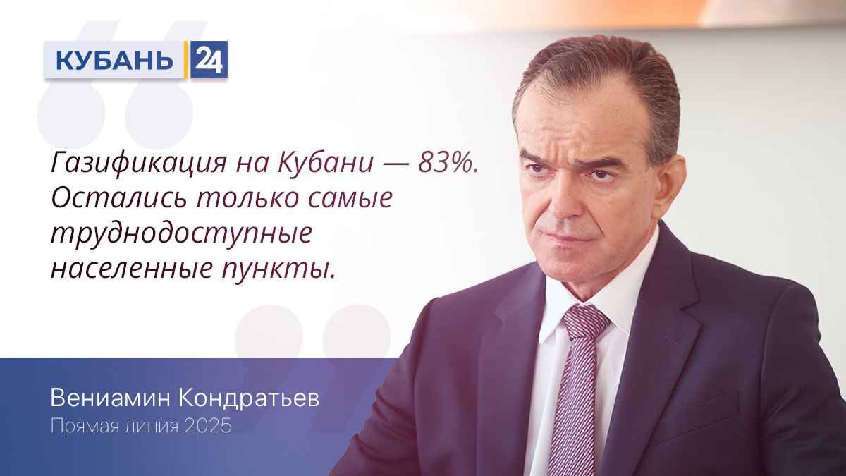 1,3 млрд рублей выделили на газификацию в Краснодарском крае в 2025 году. Газификация на Кубани — 83%. Остались только самые труднодоступные населенные пункты. Нужно смотреть, какая трудность возникла в данном случае, — сказал Кондратьев.