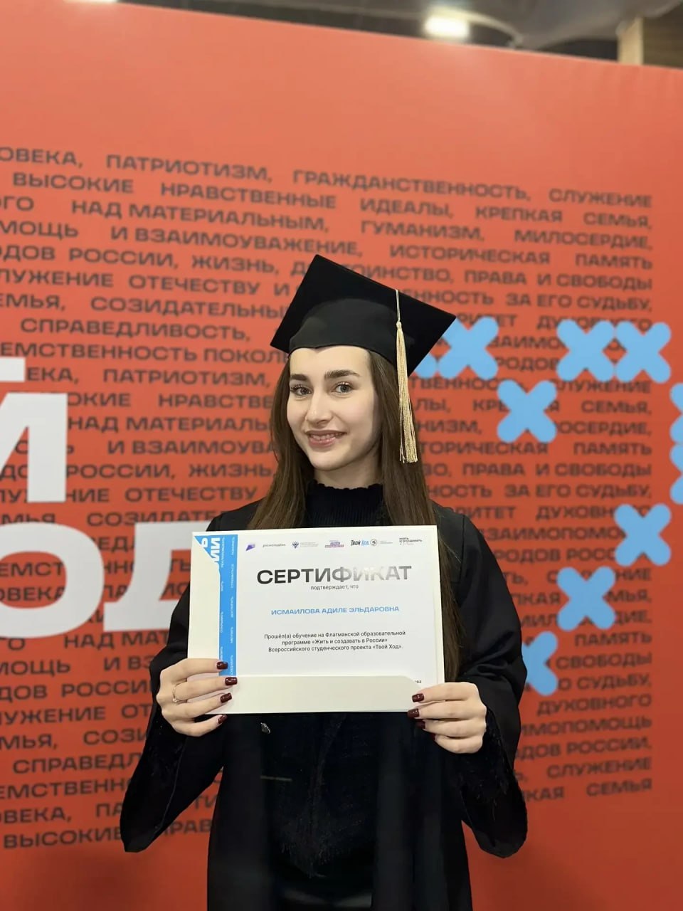 Студентка из Новороссийска Исмаилова Адиле приняла участие во Всероссийском студенческом форуме «Твой Ход», который прошёл с 12 по 16 декабря 2025 года в Москве. Форум стал площадкой для подведения итогов пятого сезона одноимённого всероссийского проекта.