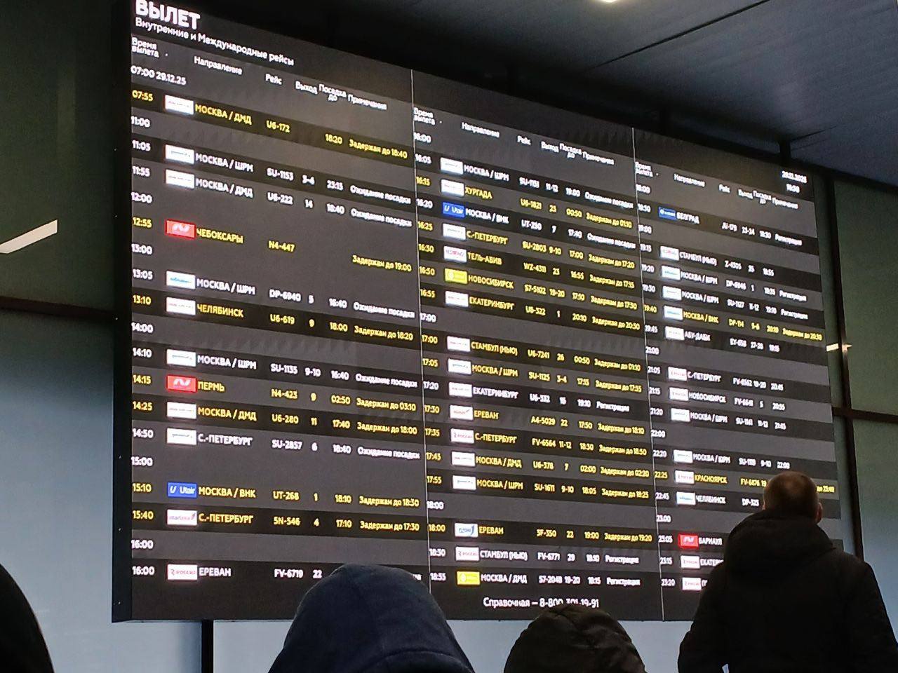 Еще 7 рейсов ушли на запасные аэродромы: Владикавказ (U-249, U-267), Грозный (SU-2856, SU-1150), Минеральные Воды (U6-171, SU-1134, N4-476).