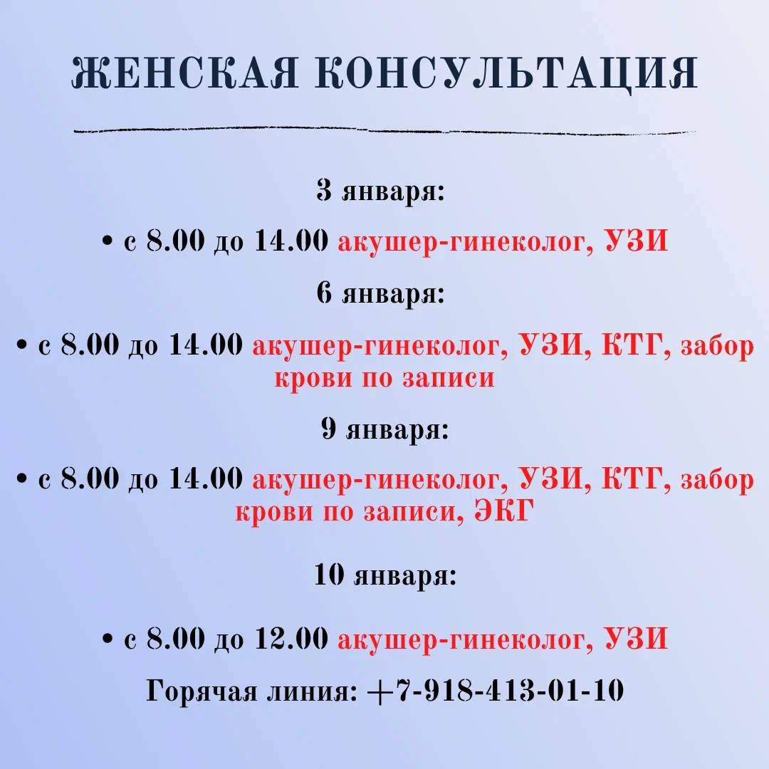 • с 8.00 до 14.00 – акушер-гинеколог, УЗИ, КТГ, забор крови по записи.