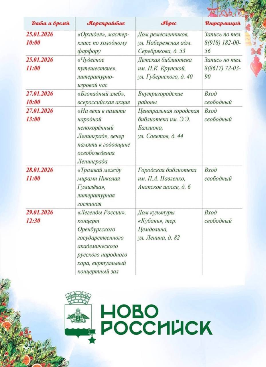 В сквере им И.Д. Черняховского до 14 января жителей и гостей Новороссийска ждет «Новогодний арт-базар», где мастера-ремесленники представят свои произведения декоративно-прикладного искусства и проведут мастер-классы по изготовлению новогодних сувениров. А 06 января здесь состоится захватывающая познавательная программа для детей и взрослых «Новогоднее этно-путешествие».
