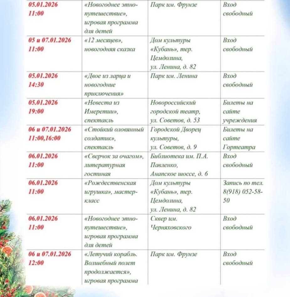 В доме культуры «Кубань» ребят и их родителей 05 и 07 января ждет сказочное представление «Двенадцать месяцев», а 06 января пройдет мастер-класс по изготовлению рождественской игрушки.