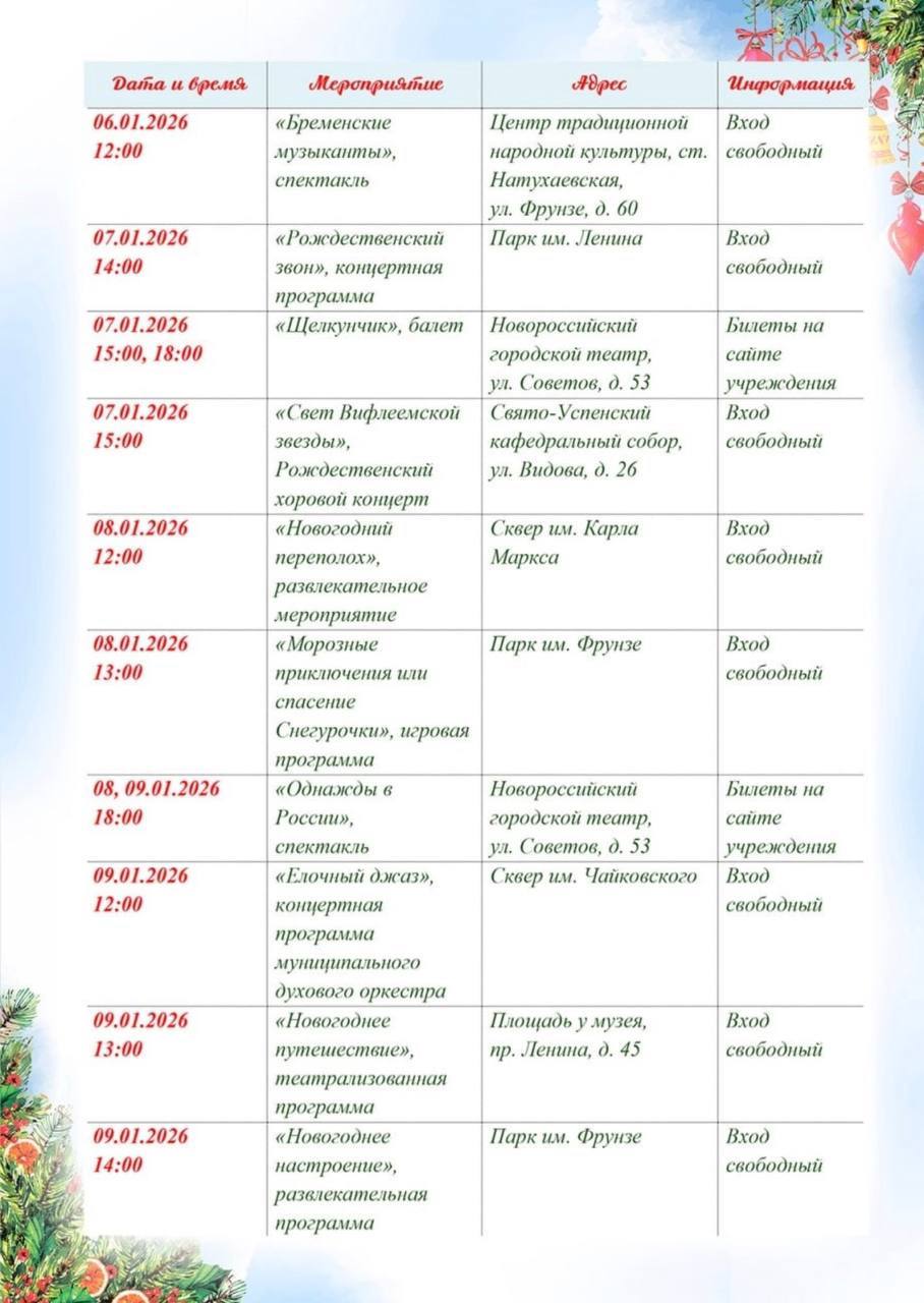 07 января в честь празднования Рождества Христова городская культурная программа будет наполнена особыми событиями: в Свято-Успенском кафедральном соборе пройдет рождественский хоровой концерт «Свет Вифлеемской звезды», в парке им. В.И. Ленина состоится концерт «Рождественский звон», а вечером на сцене гортеатра любителей классического искусства ждут на балете «Щелкунчик».