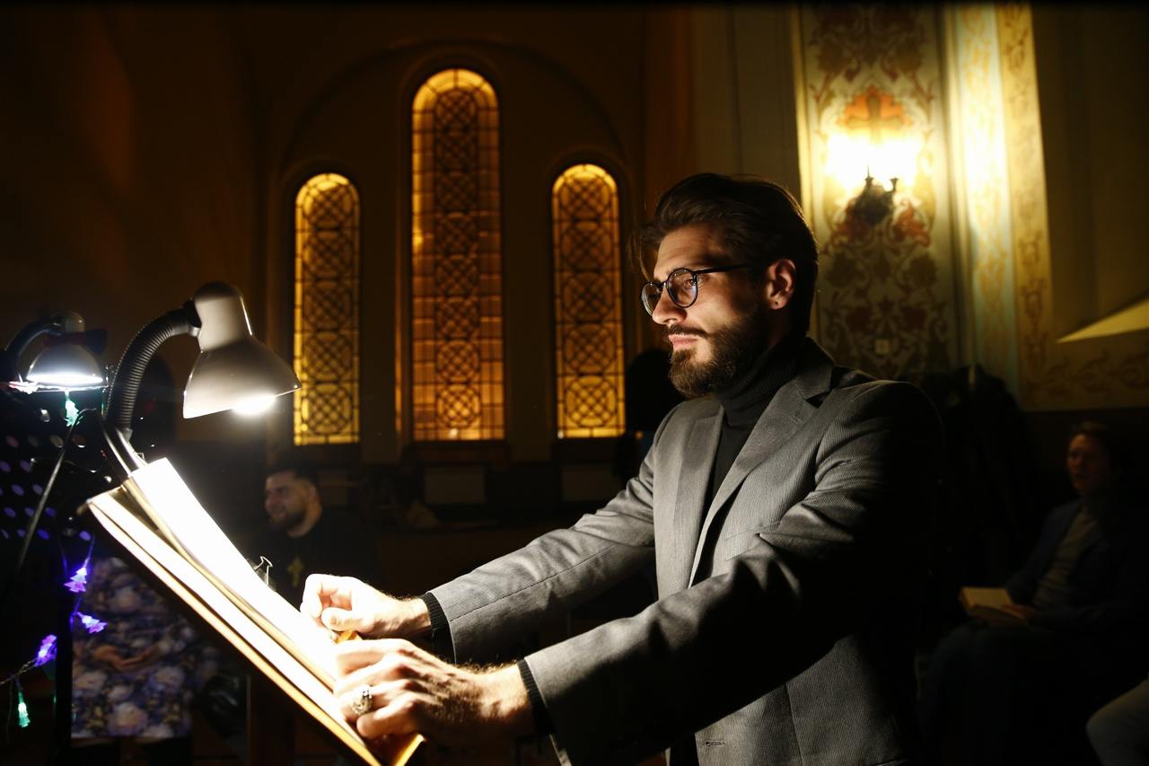 Перед началом службы в Свято-Екатерининском кафедральном соборе Вениамин Кондратьев поздравил главу Кубанской митрополии с Рождеством Христовым и вручил ему букет белых роз.