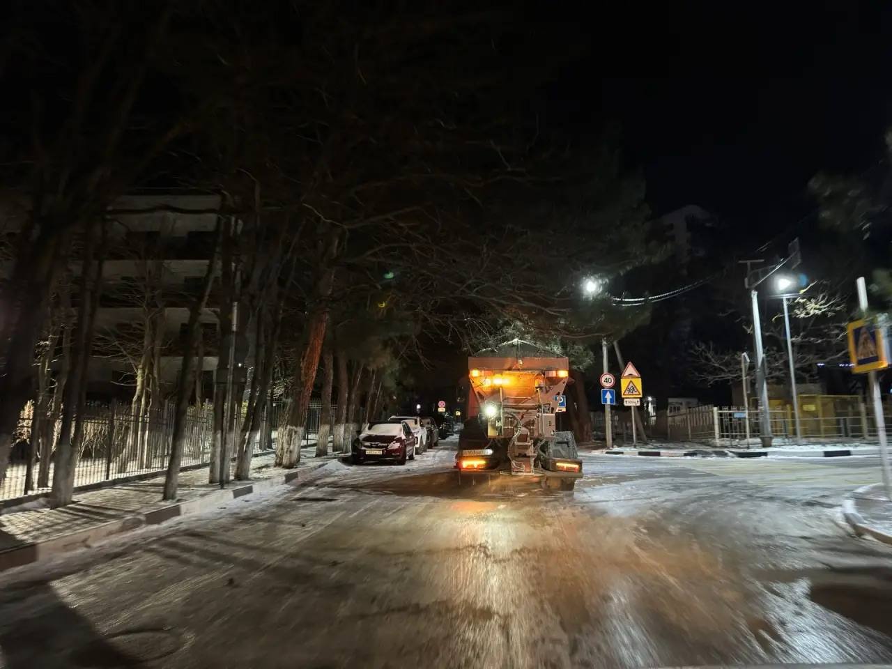 Глава Геленджика Алексей Богодистов сообщил, что коммунальные службы начали работу с 4 утра. Пять единиц техники задействовали для обработки центральных улиц города, а также подъездов к больницам и школам.