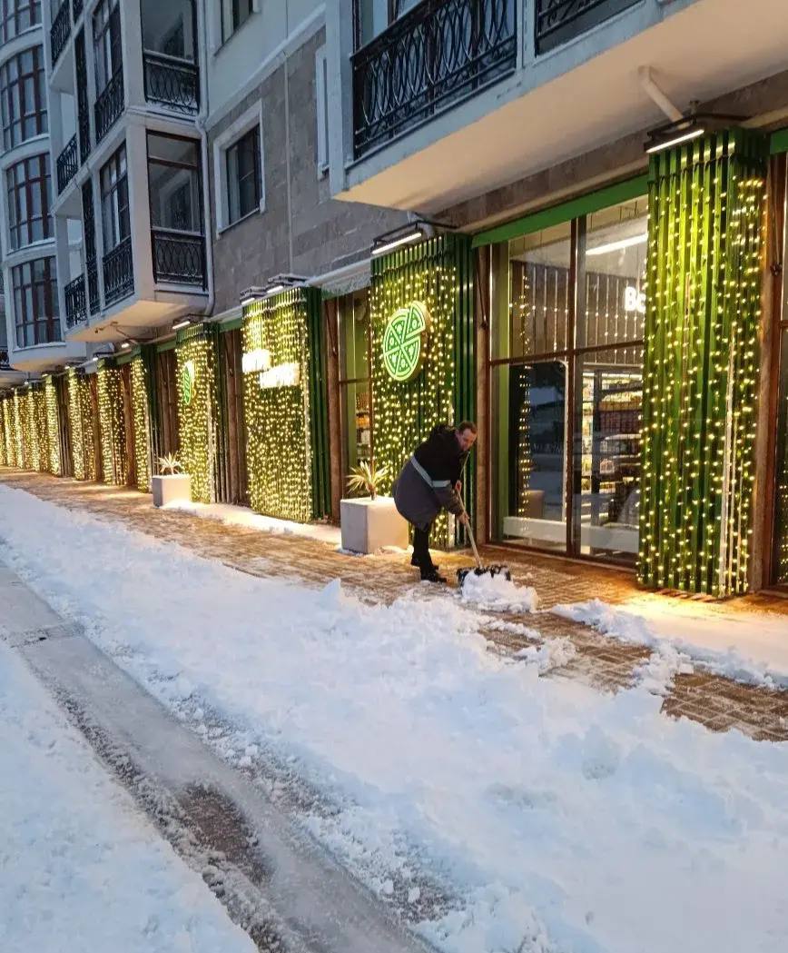 Жители курорта и предприятия торговли подключились к расчистке снега на прилегающих территориях.