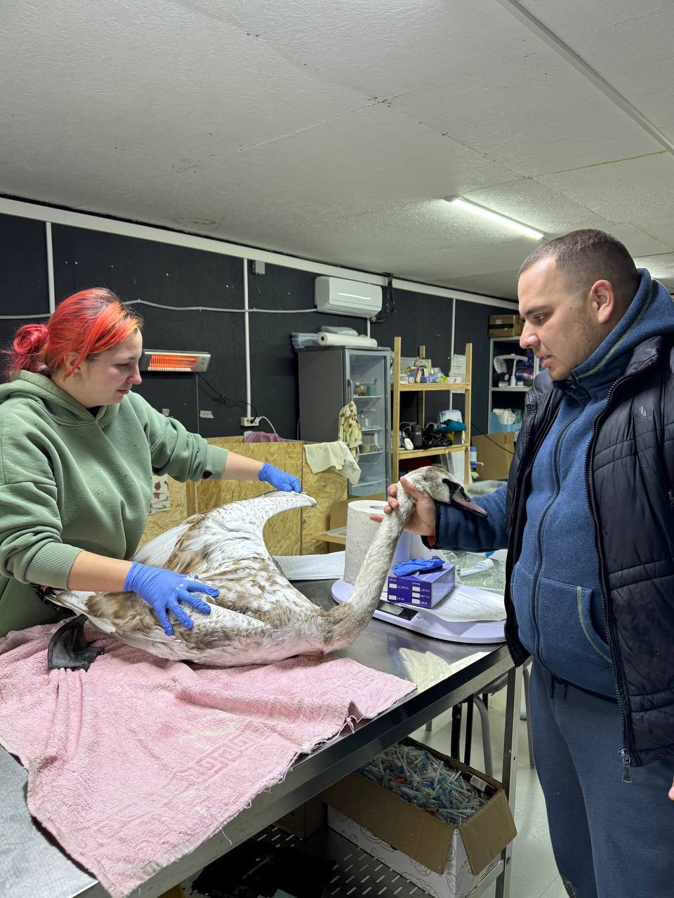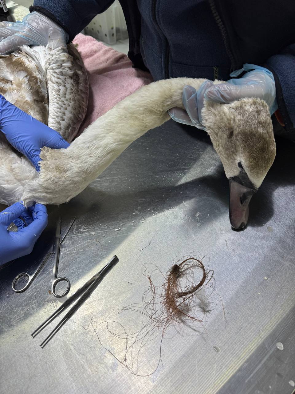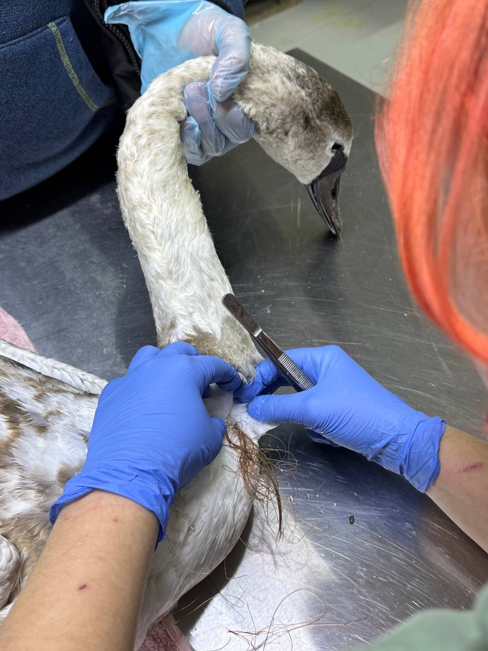 Специалисты осмотрели лебедя, аккуратно обрезали леску и обработали рану