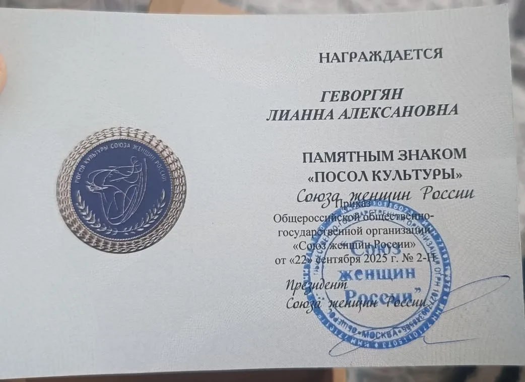 Лианна Геворгян из Новороссийска получила высокое звание «Посол культуры Союза женщин России»