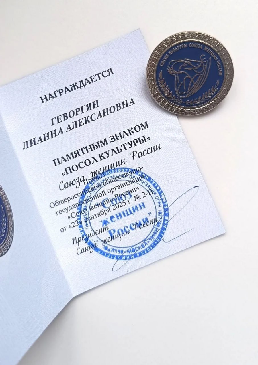 Лианна Геворгян из Новороссийска получила высокое звание Посол культуры Союза женщин России