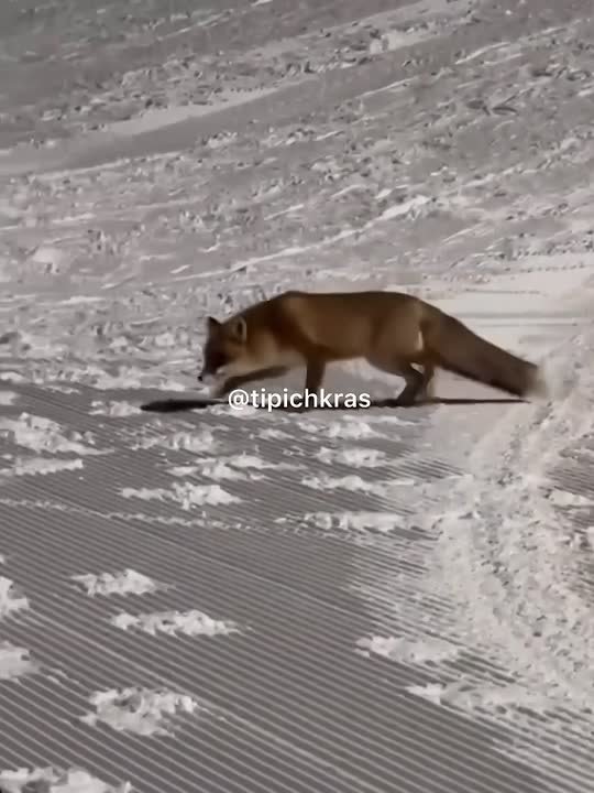 Где на полусогнутых, где боязливо отпрыгивая, но лиса прогулялась по заснеженному склону, вызвав ажиотаж среди катающихся туристов. Склон на время перестал существовать, внимание переключилось на дикого зверя.