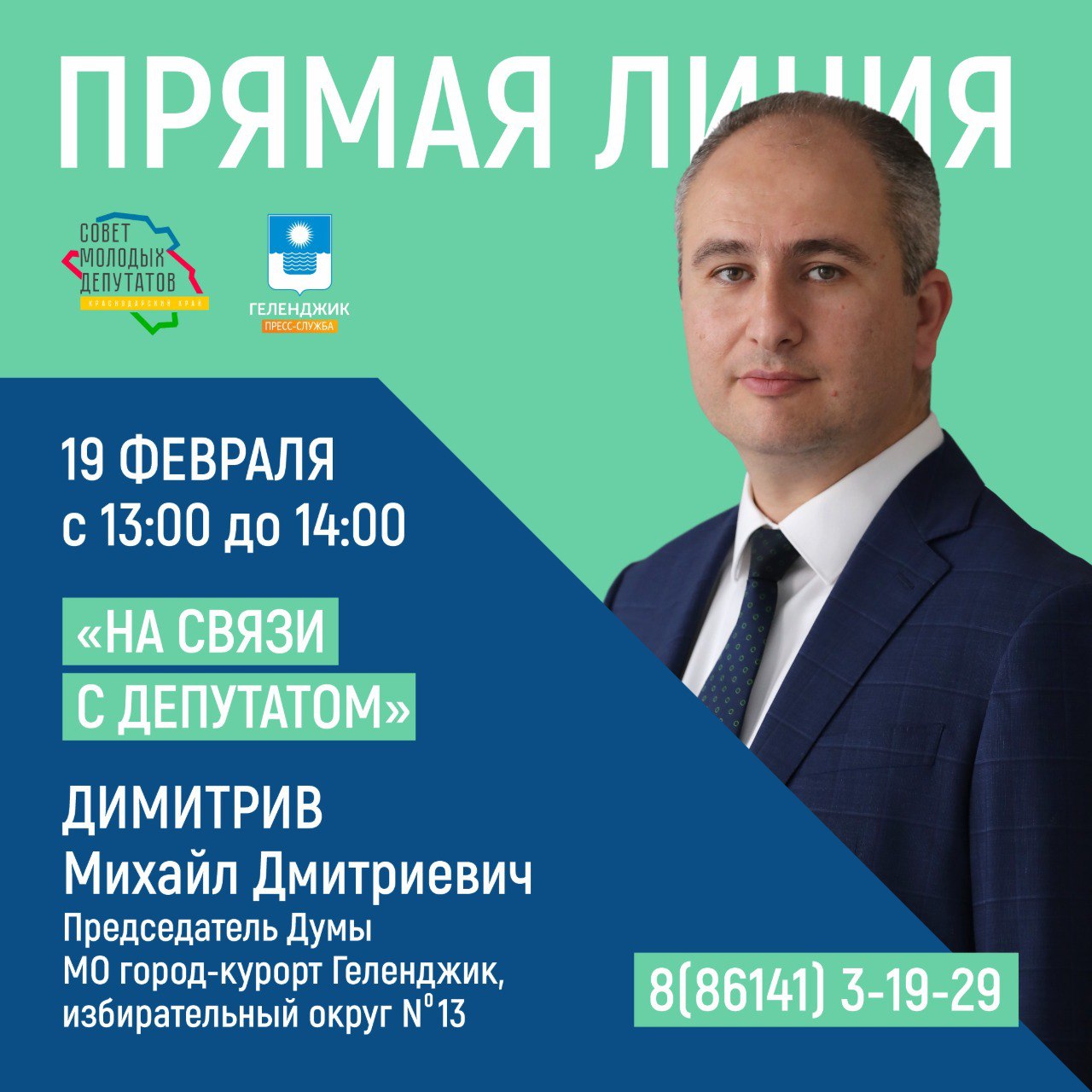 19 февраля с 13:00 до 14:00 на базе Муниципального центра управления состоится «Прямая линия». На вопросы и предложения жителей курорта ответит председатель Думы Геленджика, депутат по избирательному округу №13 Михаил Дмитриевич Димитриев.