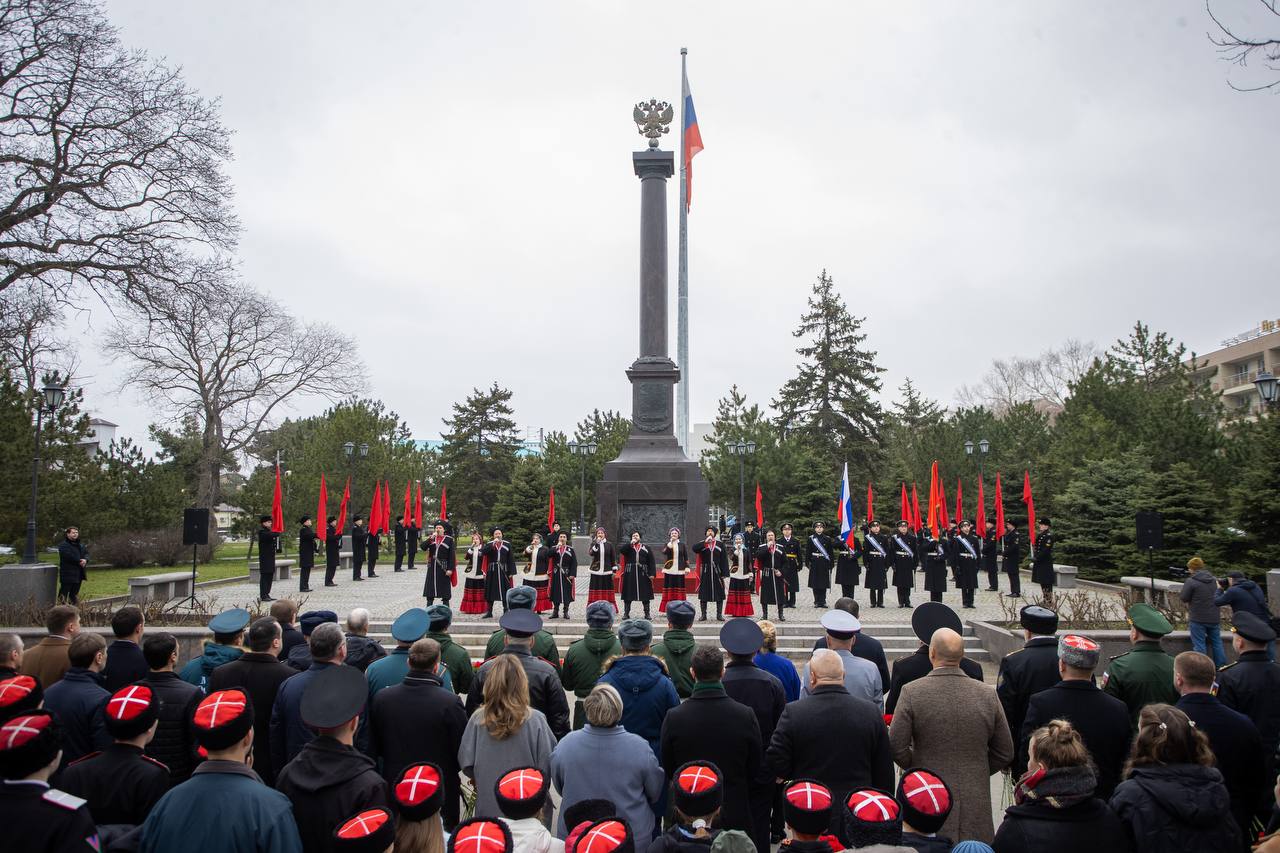 После минуты молчания в память о военнослужащих, погибших при исполнении воинского долга, подвиг которых всегда будет жить в сердцах благодарных анапчан, к стеле возложили Гирлянду славы и цветы.