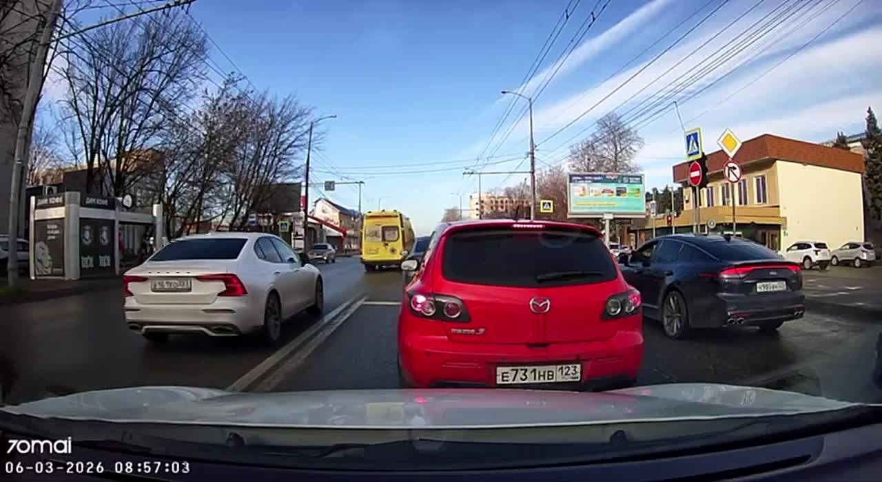 Автохам «сопроводил» машину скорой помощи в Краснодаре, нарушив ПДД.