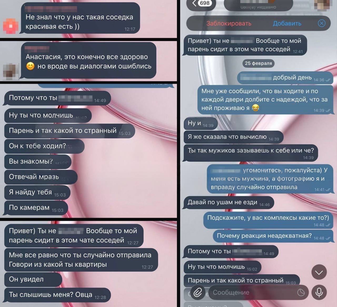 После этого одна из соседок устроила скандал: заявила, что снимок увидел её муж, и начала звонить и писать девушке с угрозами расправы.